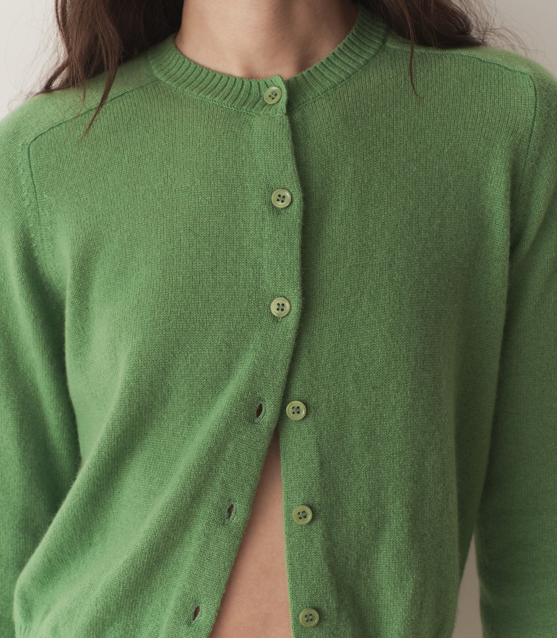 In the softest cashmere, the Claudine Cardigan features a crew neck, a fitted silhouette, full-length sleeves, and ribbing at the neckline, sleeve cuffs, and hem. A line of mother-of-pearl buttons extends down the front.