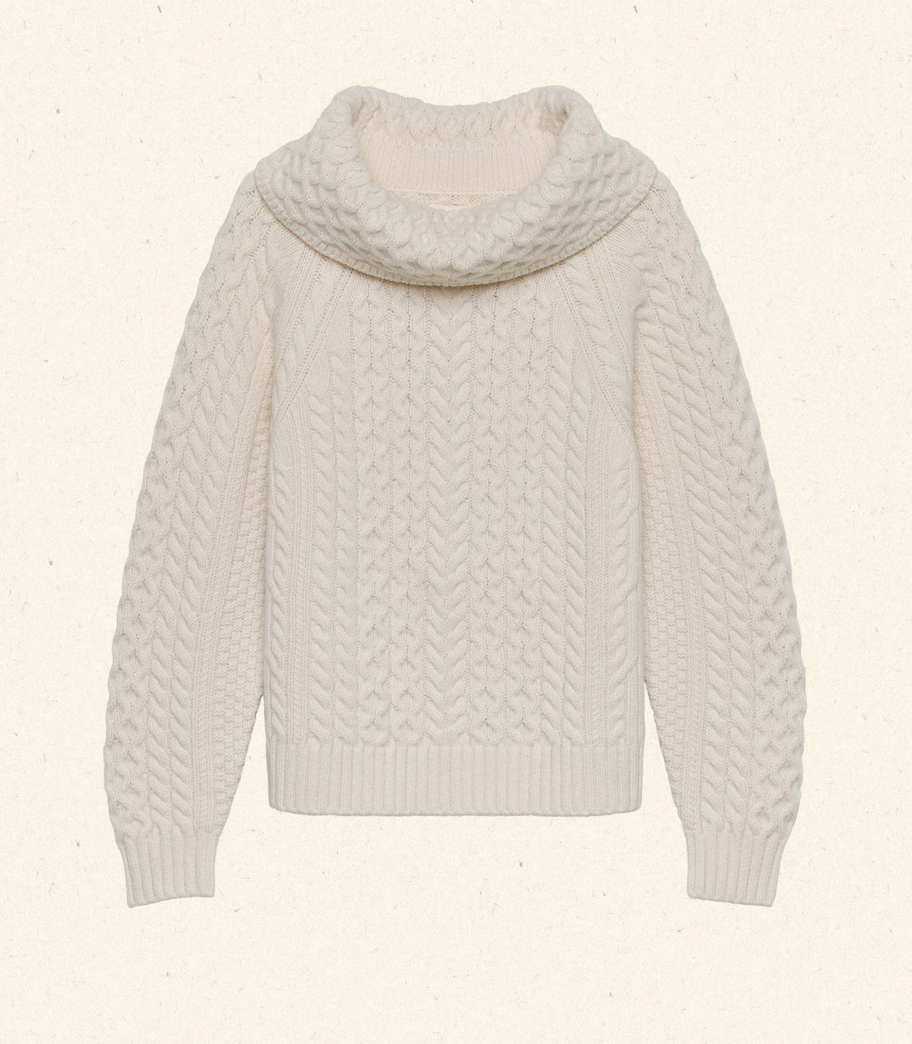 Drawing inspiration from classic fisherman’s sweaters and crafted from a cozy wool-blend, the Gillian features a relaxed silhouette, an oversized roll neck, and generous full-length sleeves. A classic cable-knit design and ribbing at the neck, hem, and cuffs add texture.