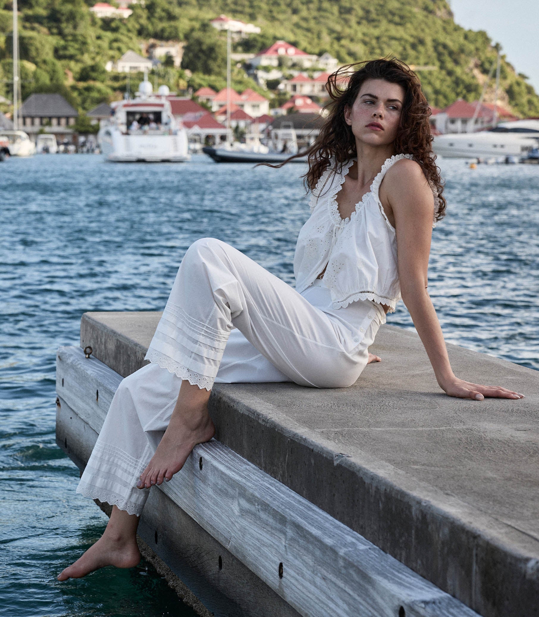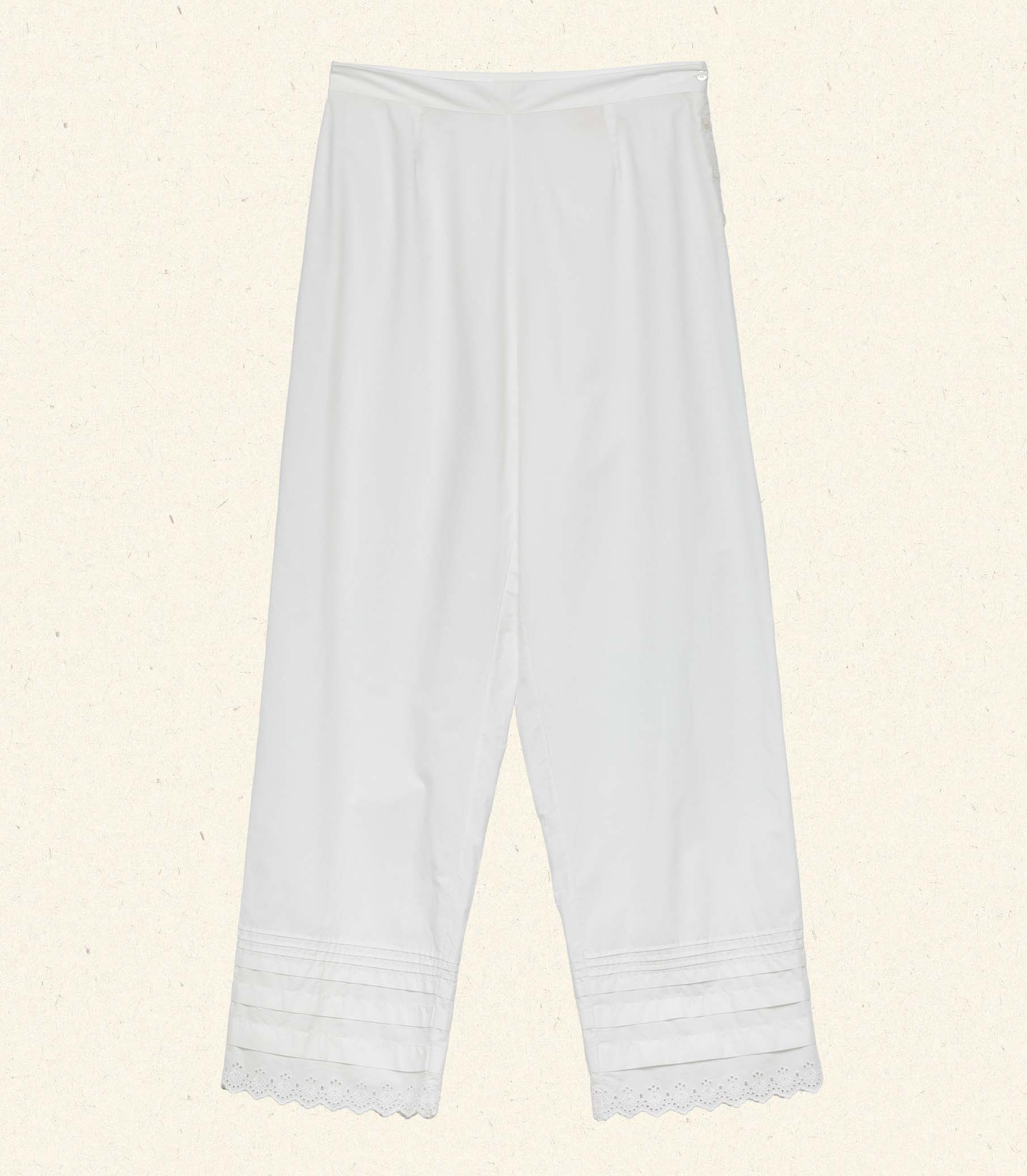 Rendered in crisp organic cotton, our Victorian-inspired Francisca Pant features an ultra-high waist, a straight leg, and darting at the front and back waist for structure. Taking cues from our best-selling Sebastiane Skirt, pintuck details and scallop eyelet embroidery adorn the hem, and mother-of-pearl buttons fasten at one side.
