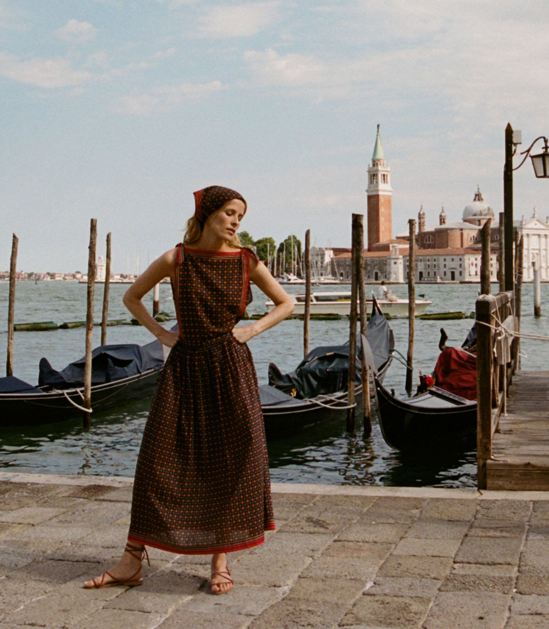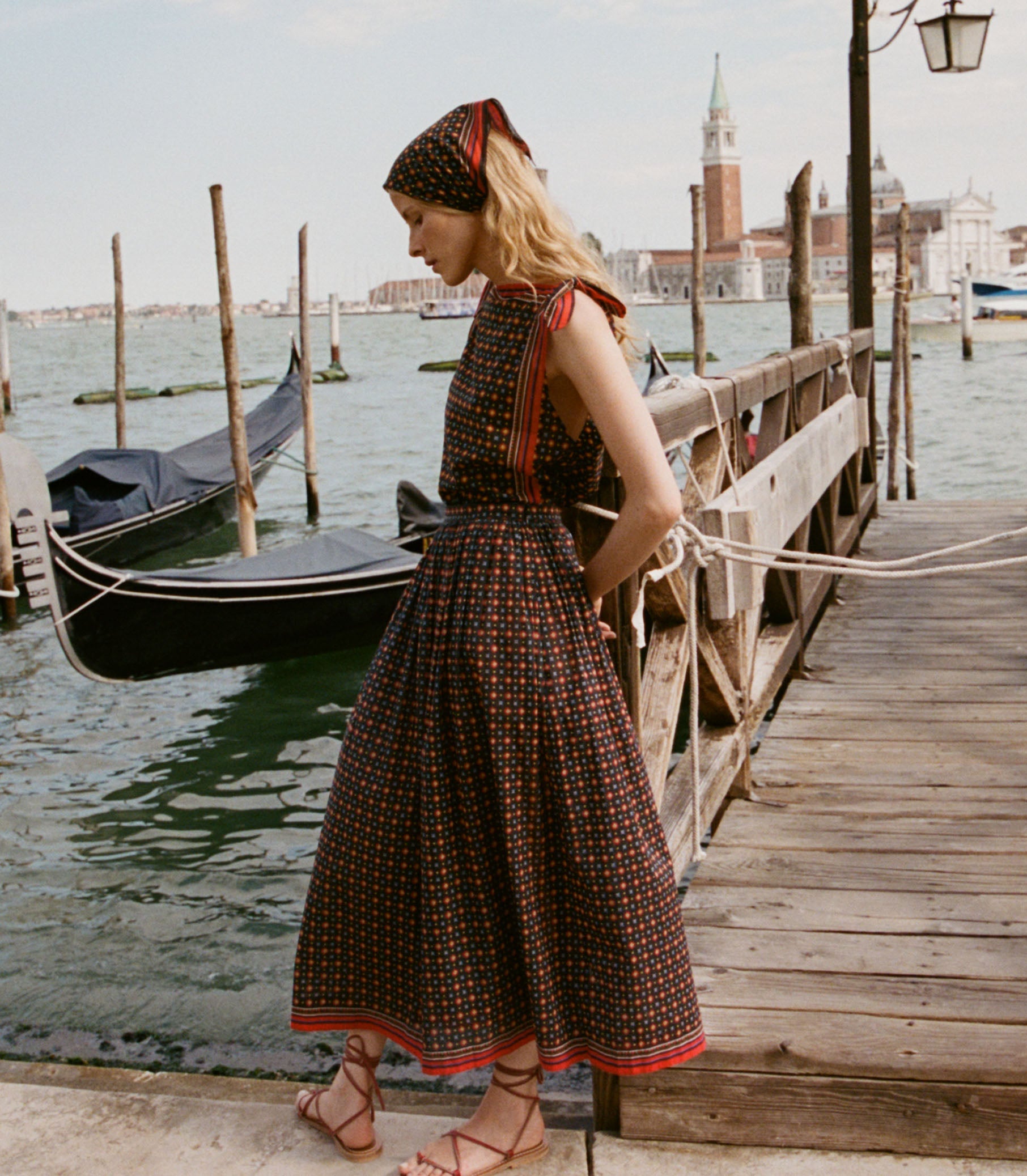 Crafted from a midweight organic cotton voile, the Maricette Skirt features a high waist and a full, ankle-grazing skirt with an invisible side zipper for the perfect fit. Rendered in our Montmarte Foulard print, the Maricette is finished with placed stripe borders along the hem.