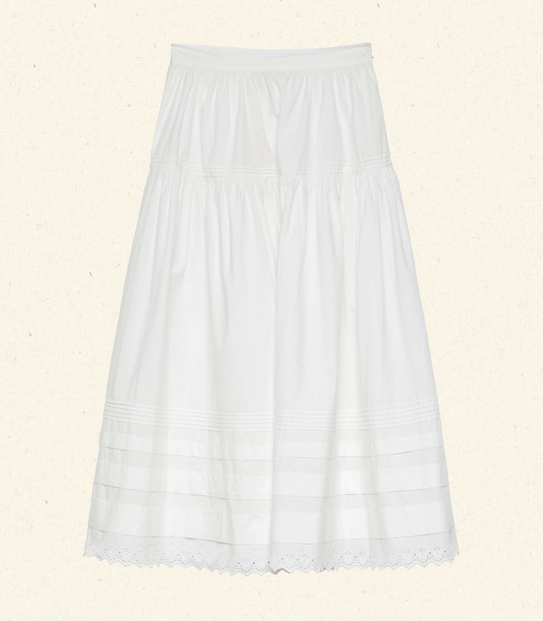 Inspired by an Edwardian-era trousseau and rendered in crisp organic cotton poplin, the Sebastiane Skirt—a forever-favorite of our styling team—features a high waist, an A-line silhouette graced with horizontal tiered pintucks, and an ankle-grazing hemline trimmed with scallop eyelet embroidery for a touch of romance. An invisible side zipper with a hook-and-eye closure creates the perfect fit. The perfect all-season skirt, we love the Sebastiane paired with knee-high boots and a voluminous knit or cozy cardigan in the winter—and with a sweet pointelle tee and sandals in warmer months.