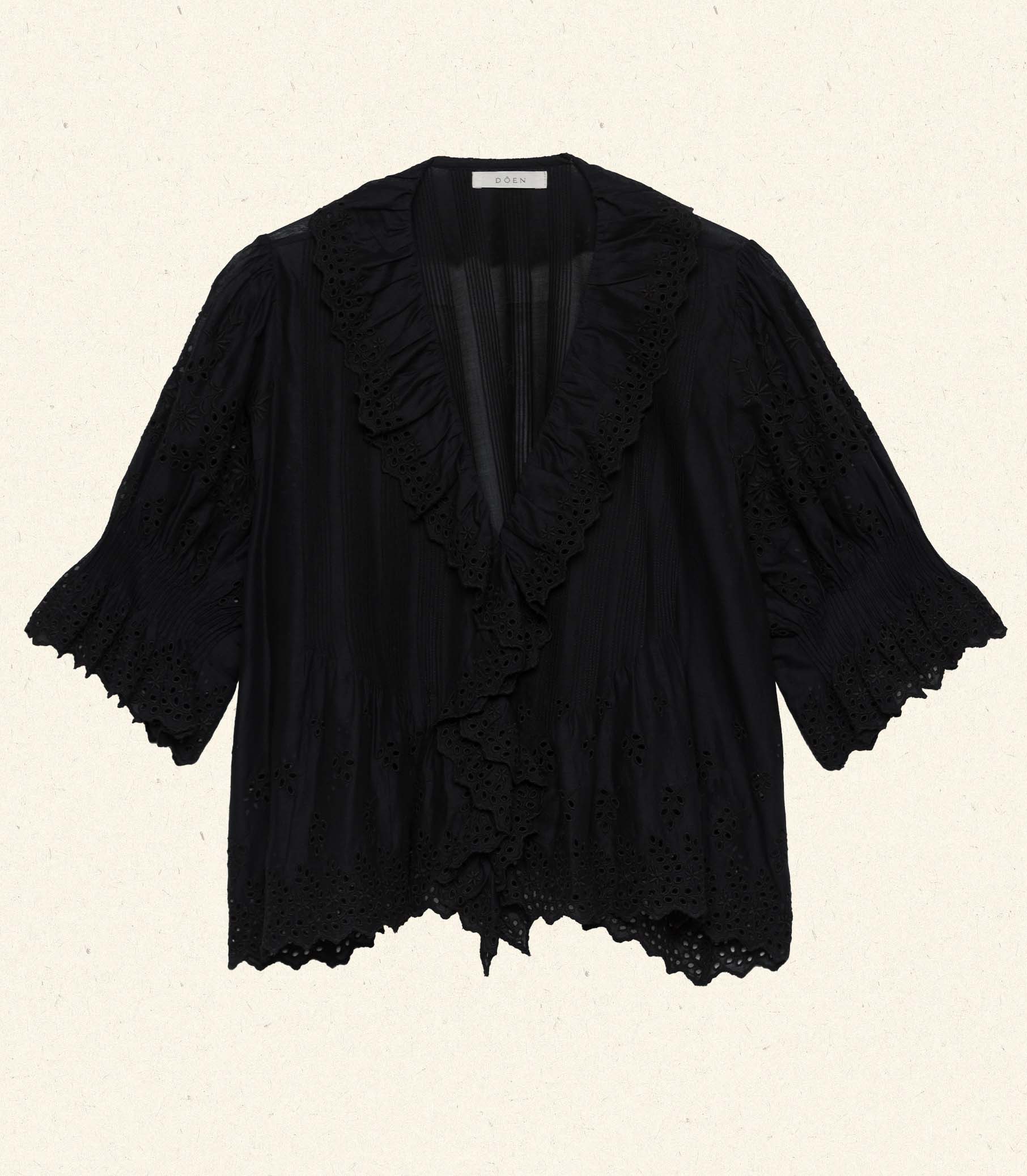 The Edwardian-inspired Henri Top—which made its debut in Spring 2018—is a Favorite Character we find ourselves returning to again and again. Crafted from soft organic cotton voile and detailed with eyelet, it features a plunging V-neckline framed with cascading lace-trimmed ruffles that extend down the bodice and delicate clustered pintucks at the yoke, back, and short puffed sleeves. A line of hidden starburst buttons run up the center front.