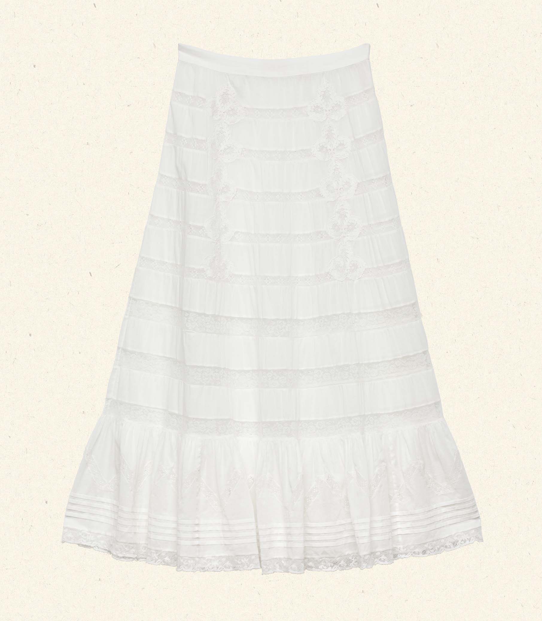 Taking cues from our beloved Angeletta Dress, the DÔEN Heirloom Allura Skirt nods to antique underpinnings, with alternating panels of shirred cotton voile and delicate inset lace in floral and dotted motifs. Lace patches run down the front and back, and an invisible side zipper offers the perfect fit.