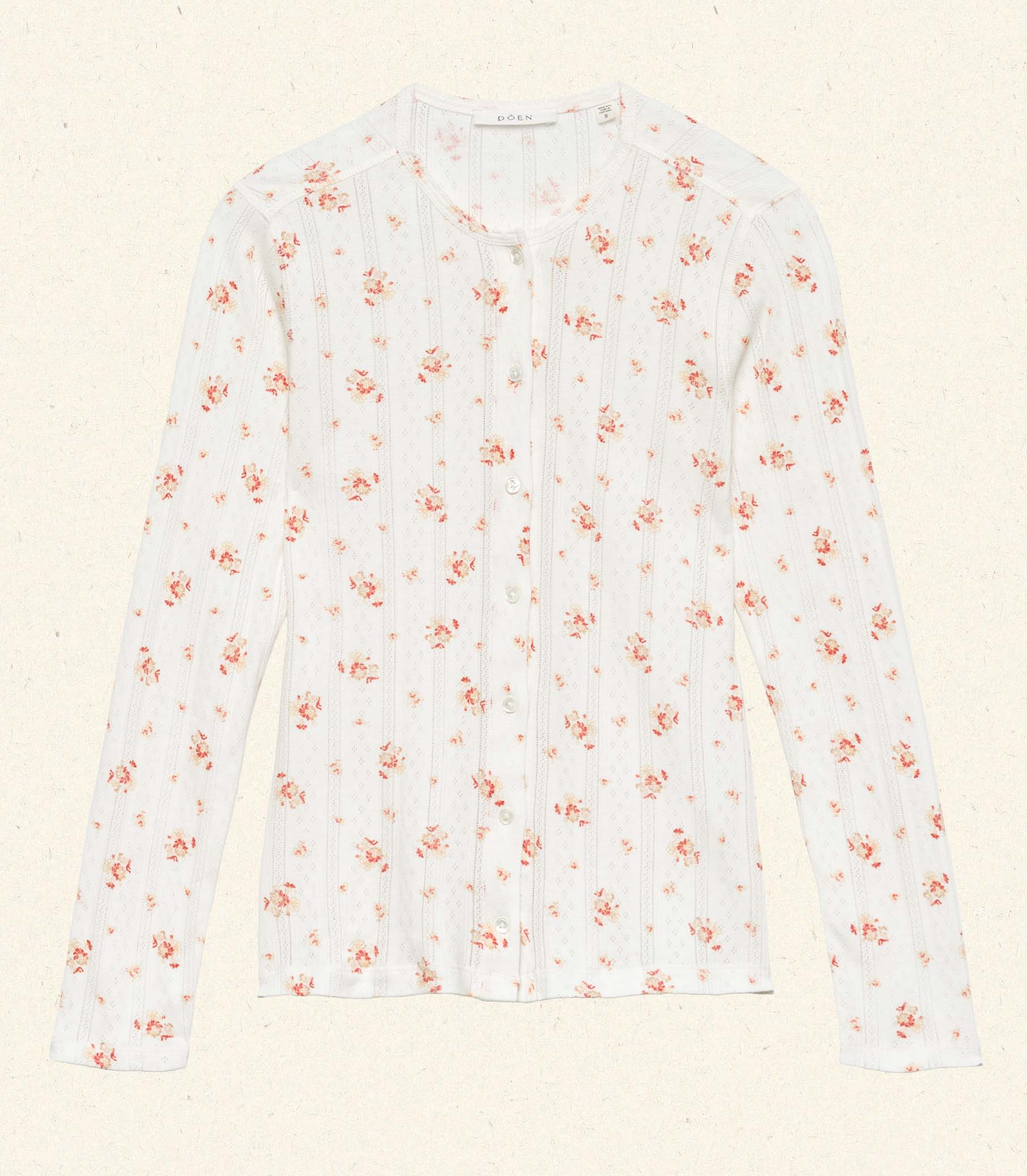 In the softest organic cotton pointelle adorned with our playful French Marigold, the ‘90s-inspired Amelie Tee features a classic crew neck, full-length sleeves, a fitted silhouette, and mother-of-pearl buttons.
