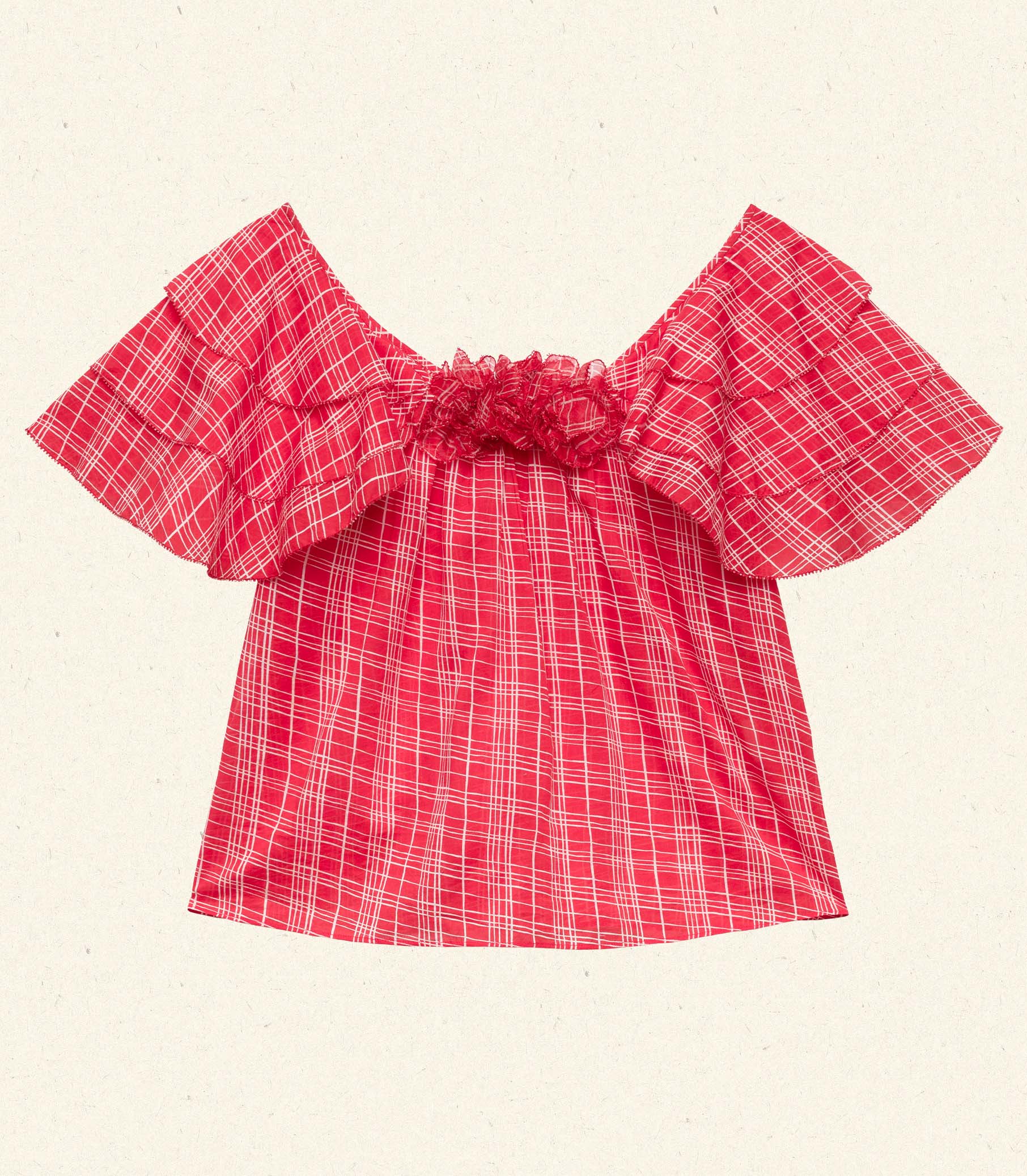 In a lightweight organic cotton voile adorned with our Sylvie Plaid, the Analicia Top features a breezy silhouette, cascading ruffles at the shoulders, and delicate silk organza flowers at the center front neckline.