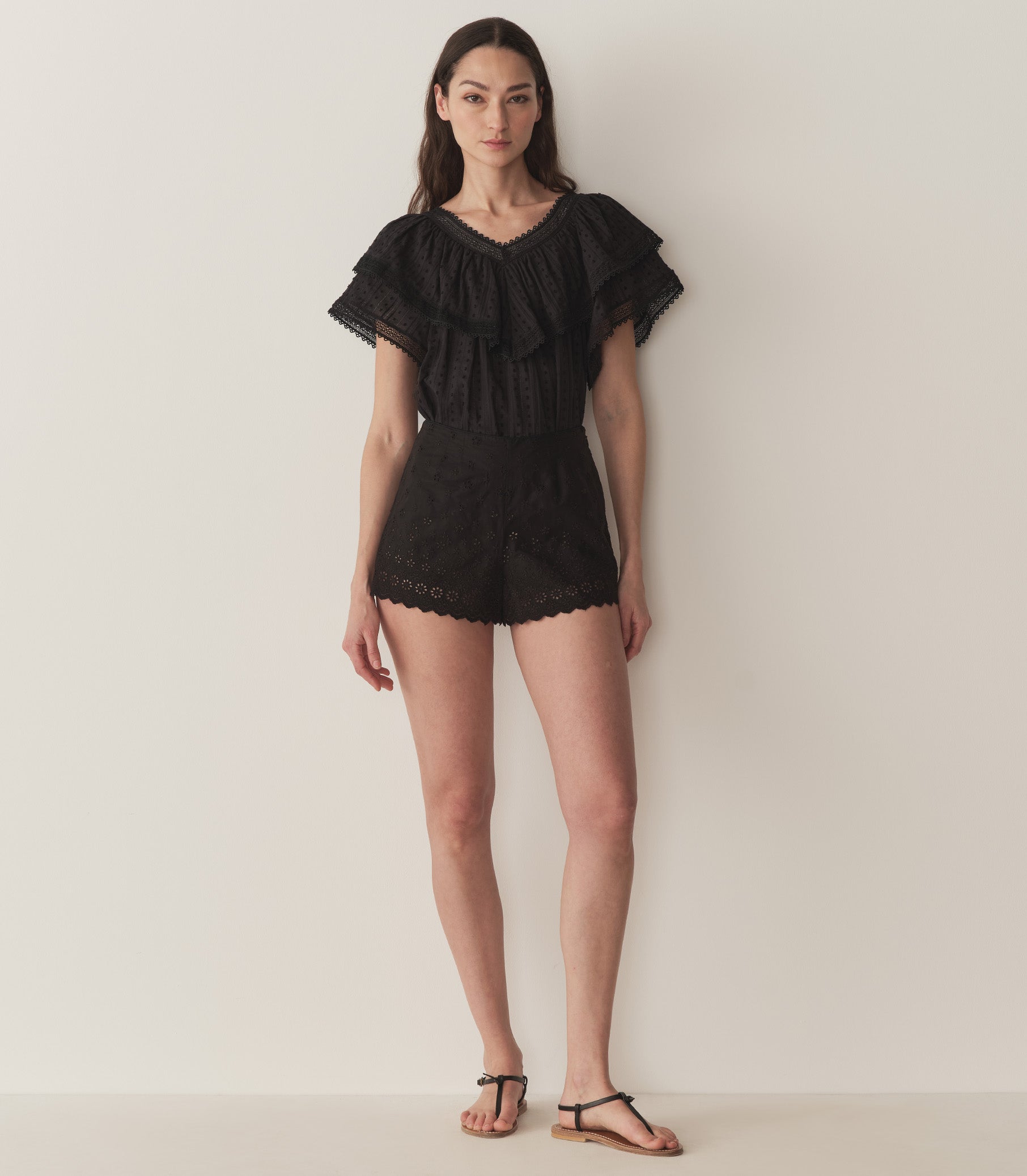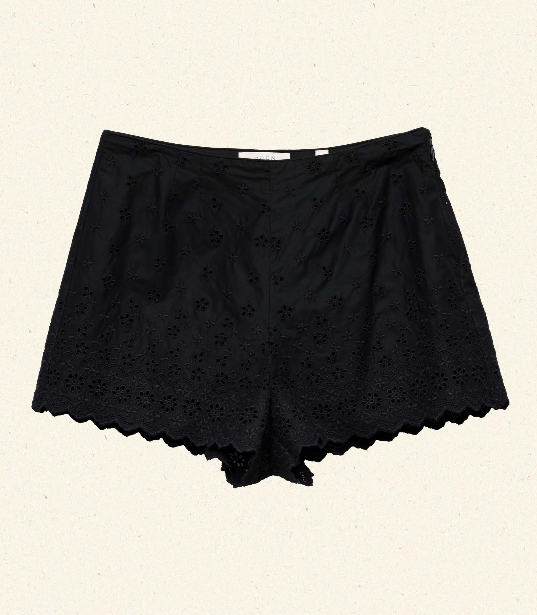 Crafted from soft, lightweight organic cotton and rendered in an allover embroidered eyelet design, the Arbre Short—a favorite of our co-founders, Margaret and Katherine—features an A-line cut, an ultra-high waist with an invisible side zipper and hook-and-eye closure, allover eyelet detailing, and scallop eyelet trim at the hem.