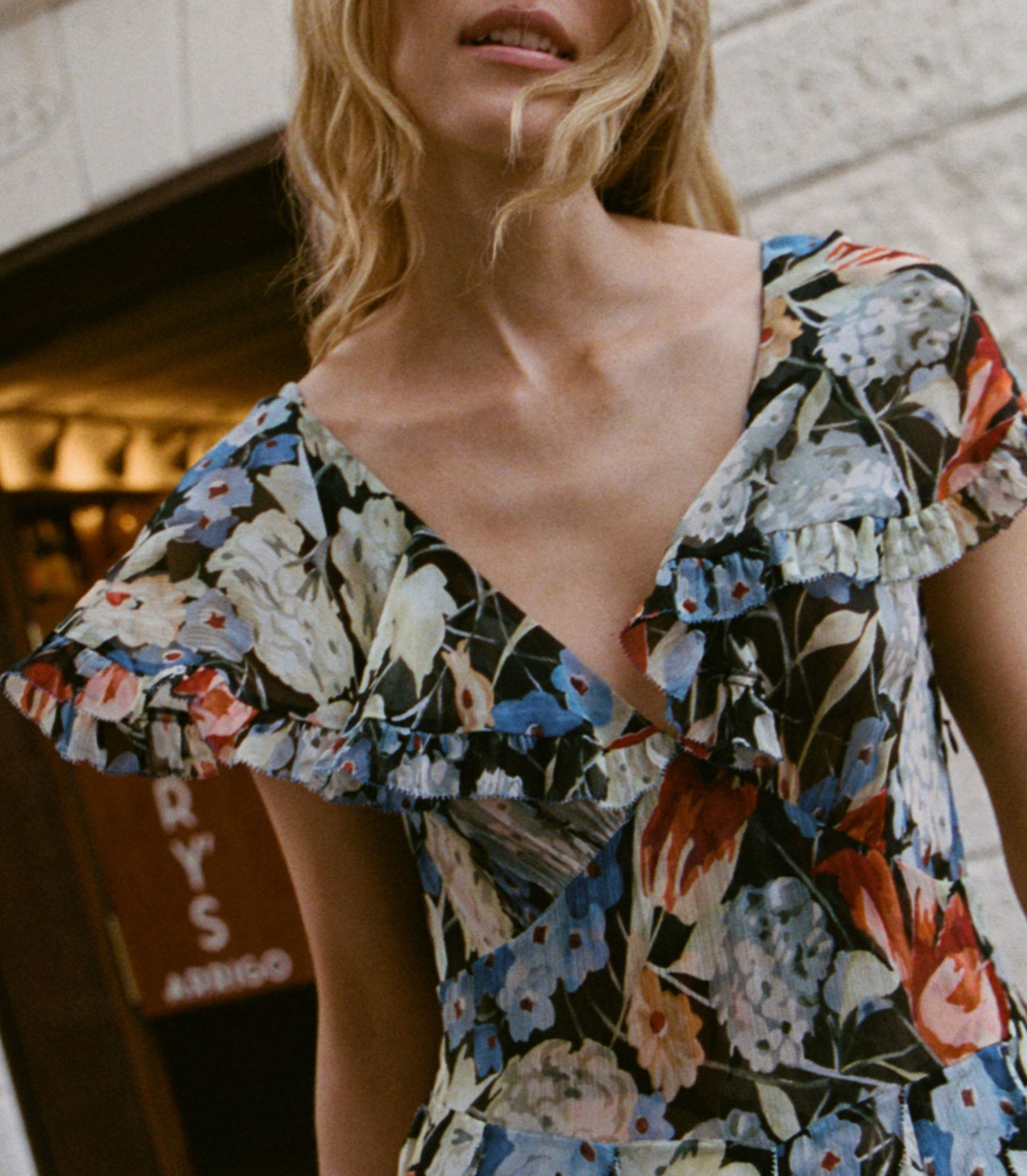 A favorite of our co-founder Katherine, the Aurelienne Dress is crafted from floaty silk crinkle chiffon and adorned with our Jardin de Villandry print—a ‘20s-inspired watercolor floral. The Aurelienne features a fitted bodice with an invisible side zipper that extends into a full-length, fully-lined skirt, and cascading picot-edged ruffles along the plunging V-neckline and skirt godets.