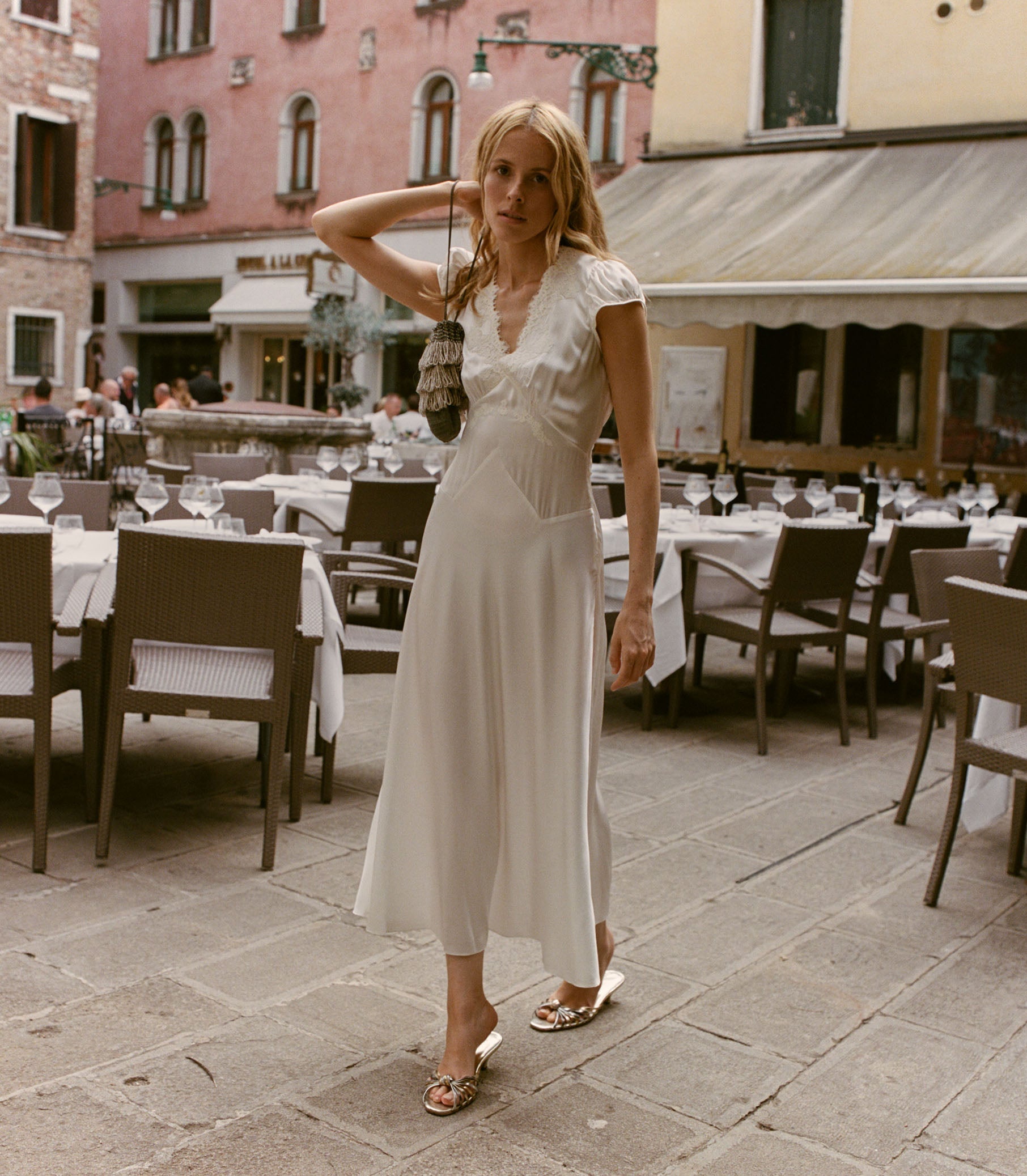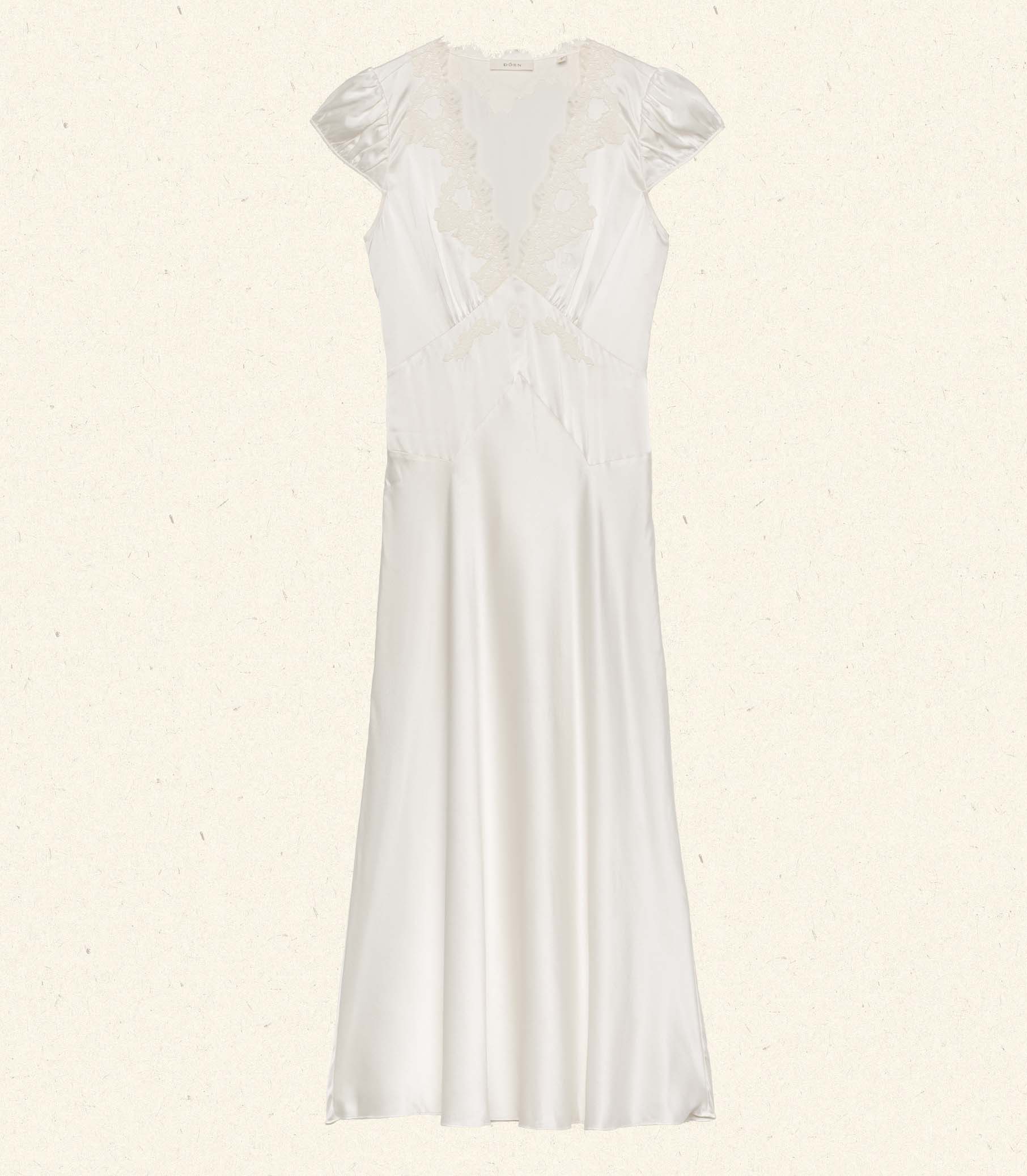 In buttery silk satin, the ‘30s-inspired Coraline Dress features gathered cap sleeves and a plunging V-neckline adorned with intricate embroidered scallop lace. A fitted bodice with an invisible side seam zipper and adjustable back waist tie gives way to a midi-length, bias-cut skirt, while an embroidered “D” at the bust adds a sweet finishing touch.