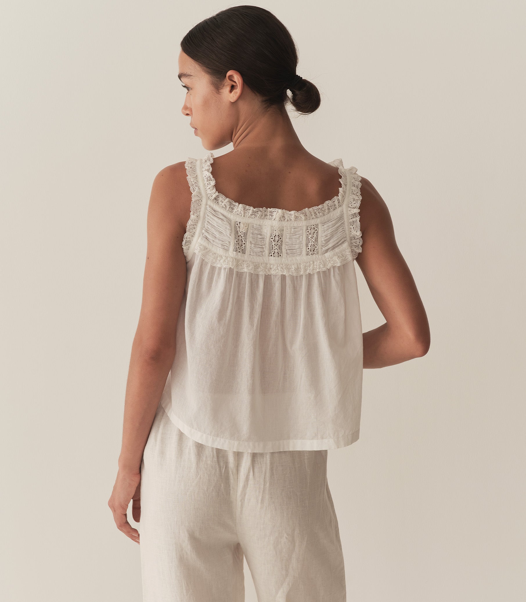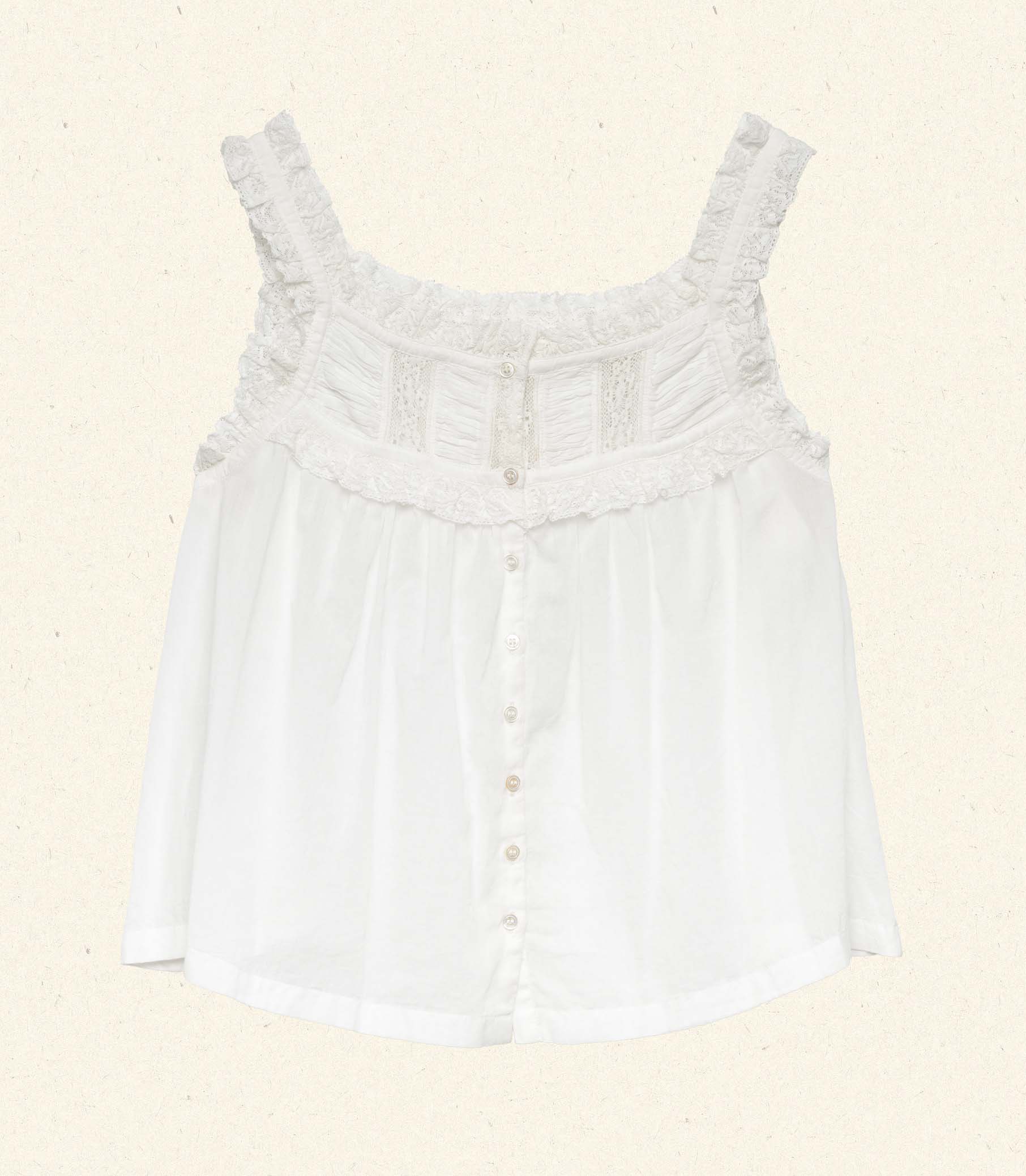 Taking cues from our beloved Frances Top—which we first designed in Spring 2019—the Fidella is a sleeveless top crafted from soft, lightweight organic cotton voile. The high square neckline is trimmed with ruffled lace, while a line of mother-of-pearl buttons extends down the center front. The yoke is adorned with alternating panels of ruching and inset lace. Leave it loose, or tuck it into your favorite pair of high-waisted jeans.
