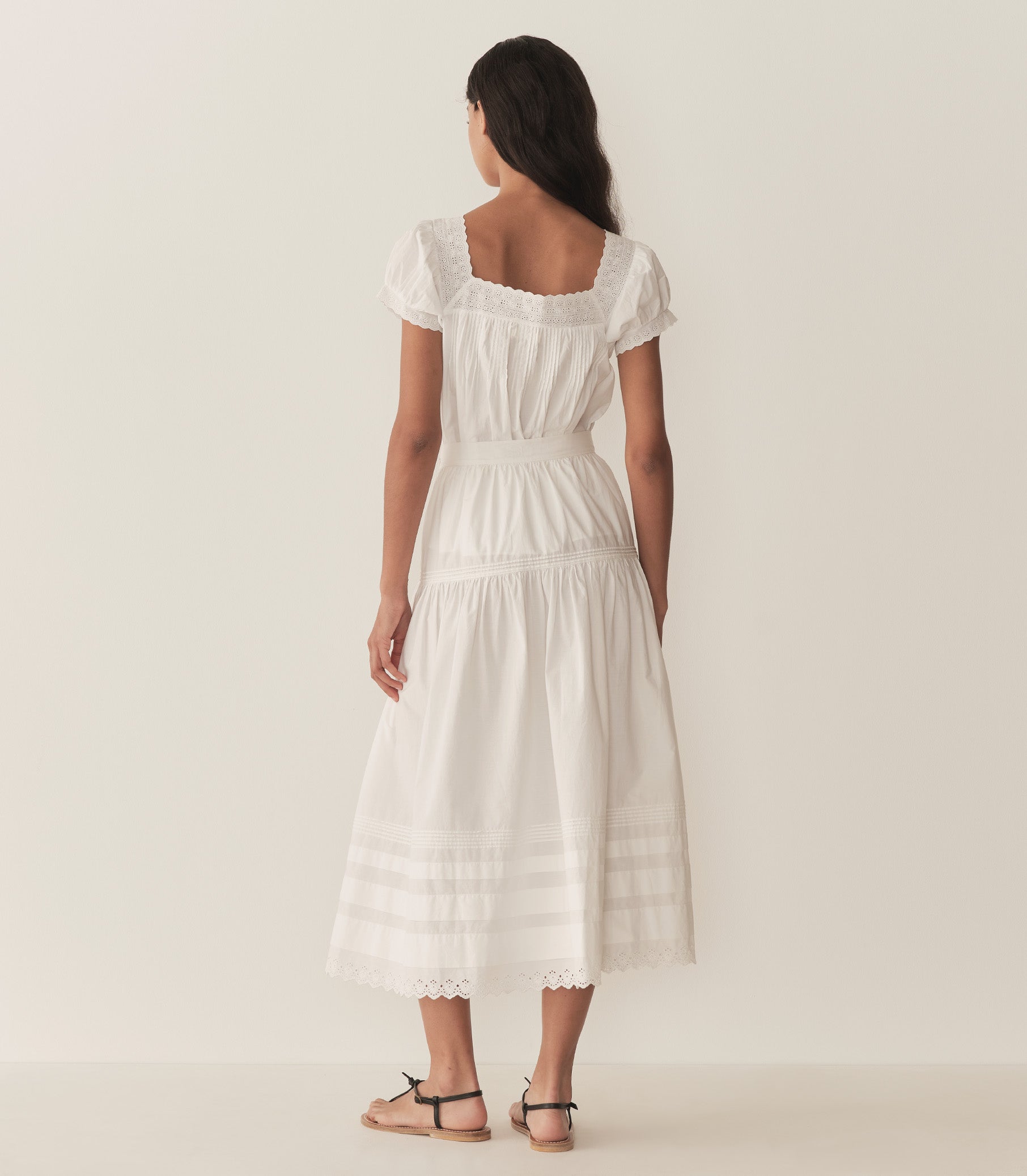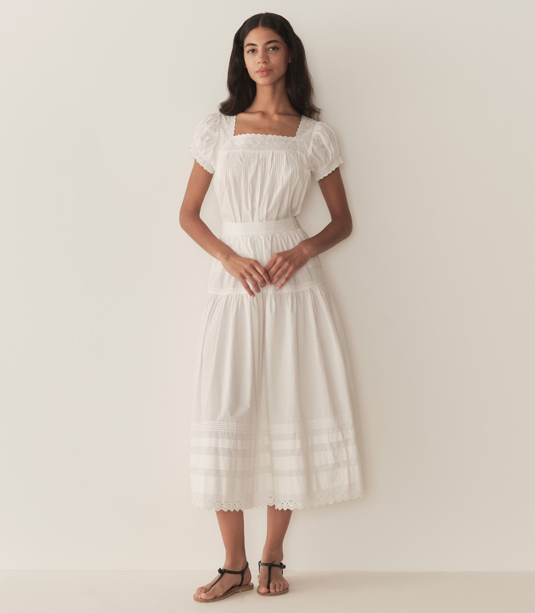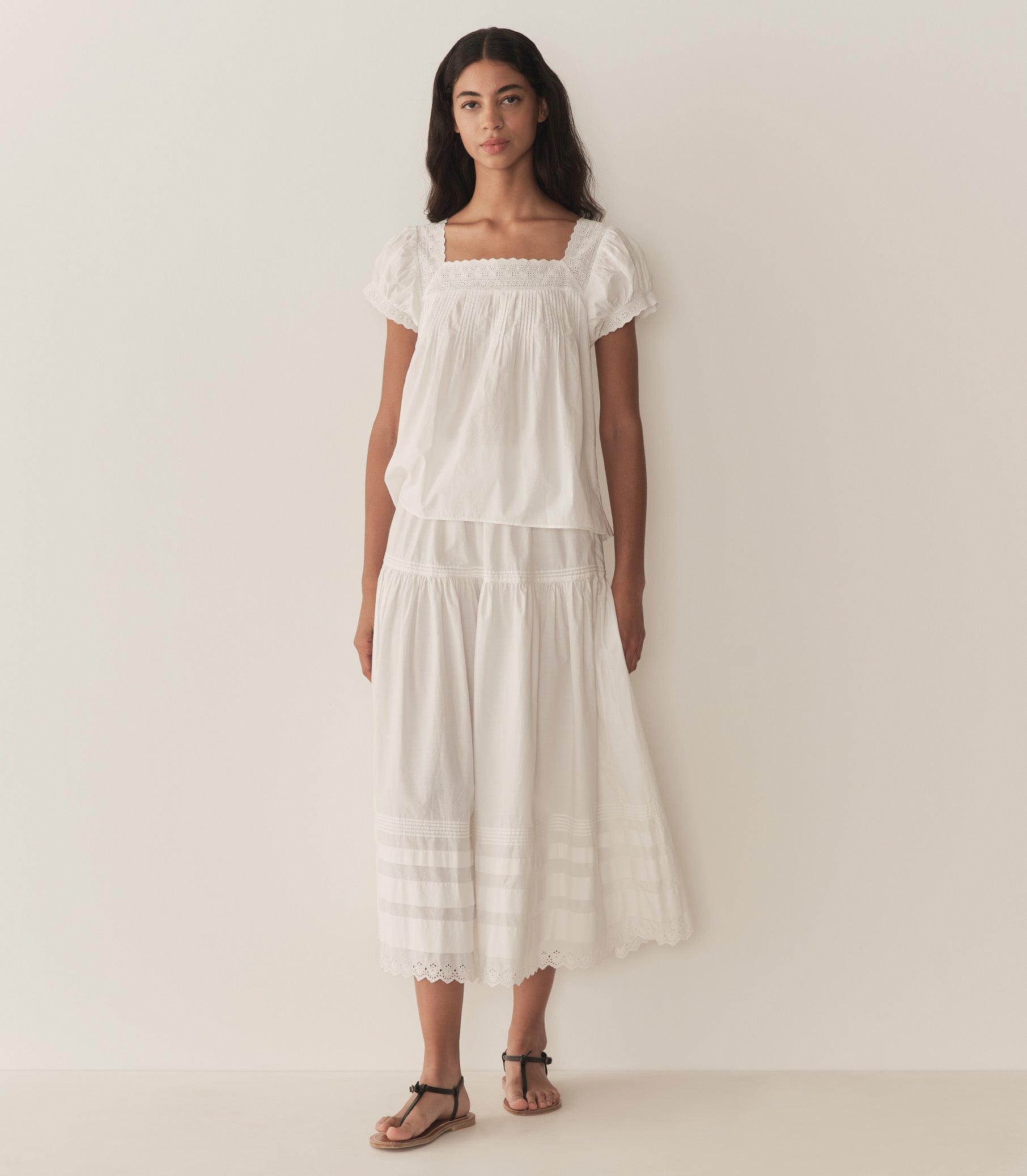 Crafted from crisp organic cotton poplin, the Francia Top features a breezy silhouette, a square neckline accented with pintucks, and short puffed sleeves. Embroidered scallop eyelets grace the sleeve cuffs and neckline. Wear it loose, or tuck it into your favorite high-waisted shorts.