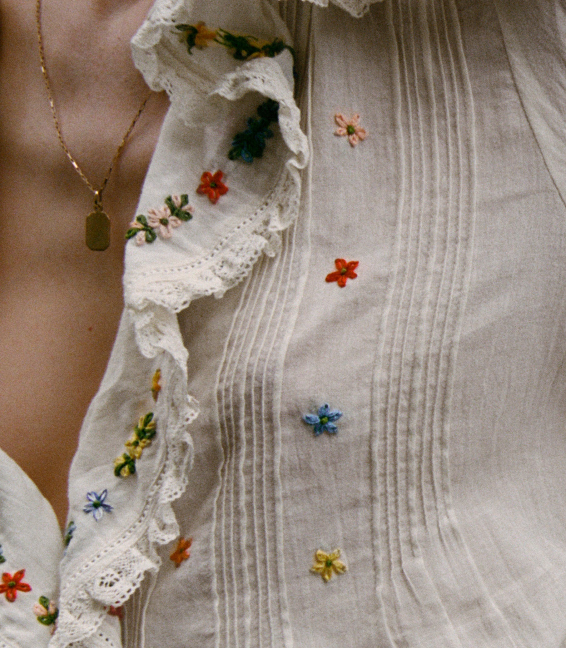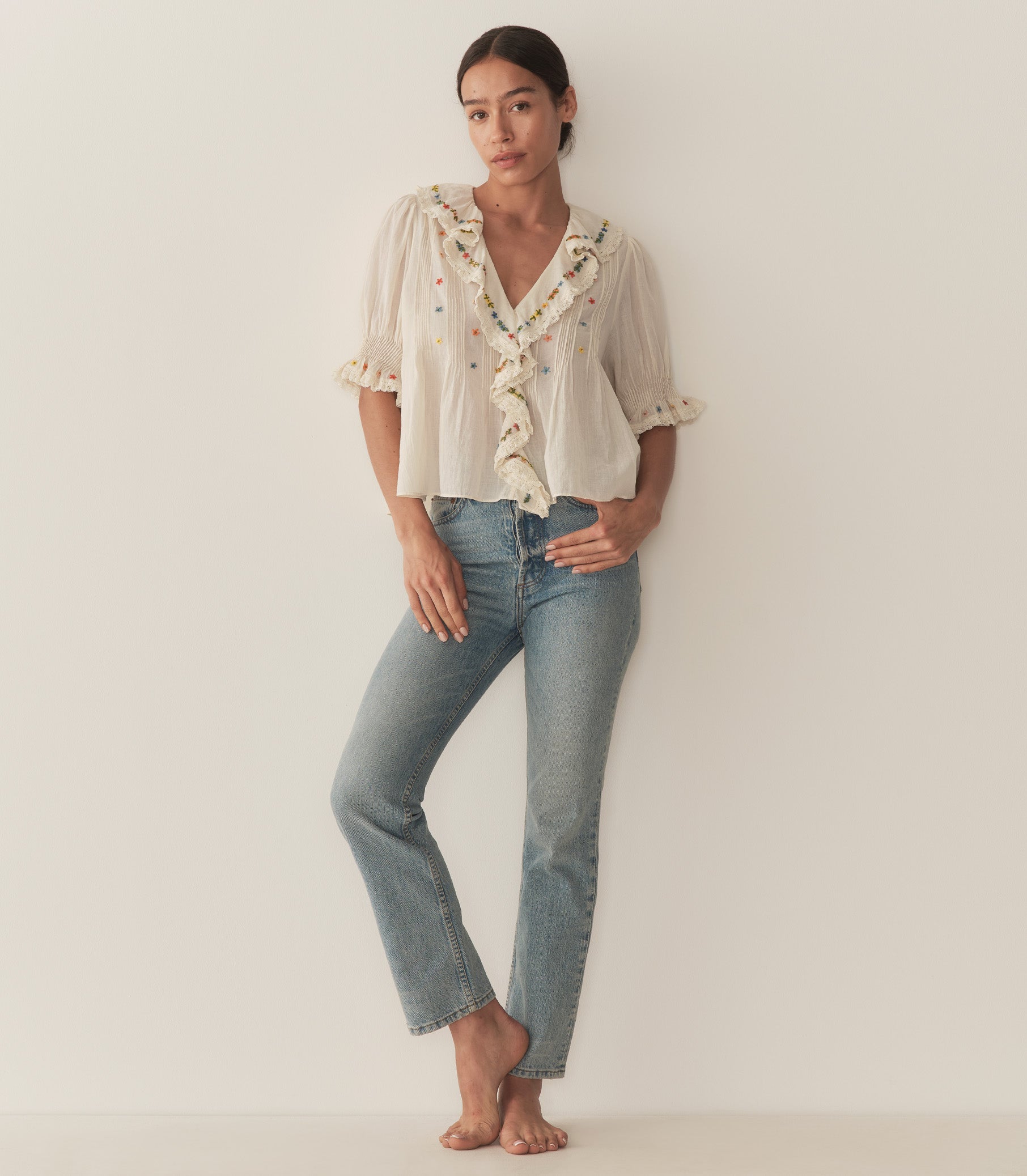 Crafted from the softest organic cotton voile, the Edwardian-inspired Hettie Top features a plunging V-neckline framed by a lace-trimmed ruffle that extends down the bodice. Colorful embroidered daisies and clustered pintucks lend texture to the yoke, back, and short puffed sleeves. A line of hidden starburst buttons extends down the center front. Wear it loose, or tuck it into your favorite high-waisted jeans.