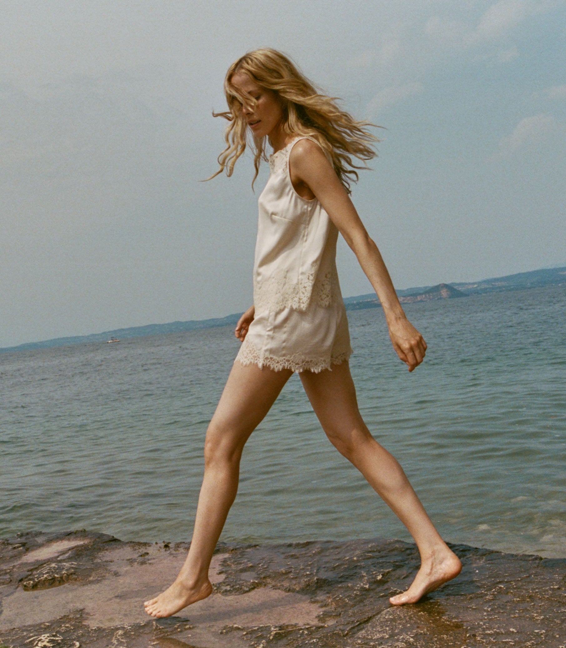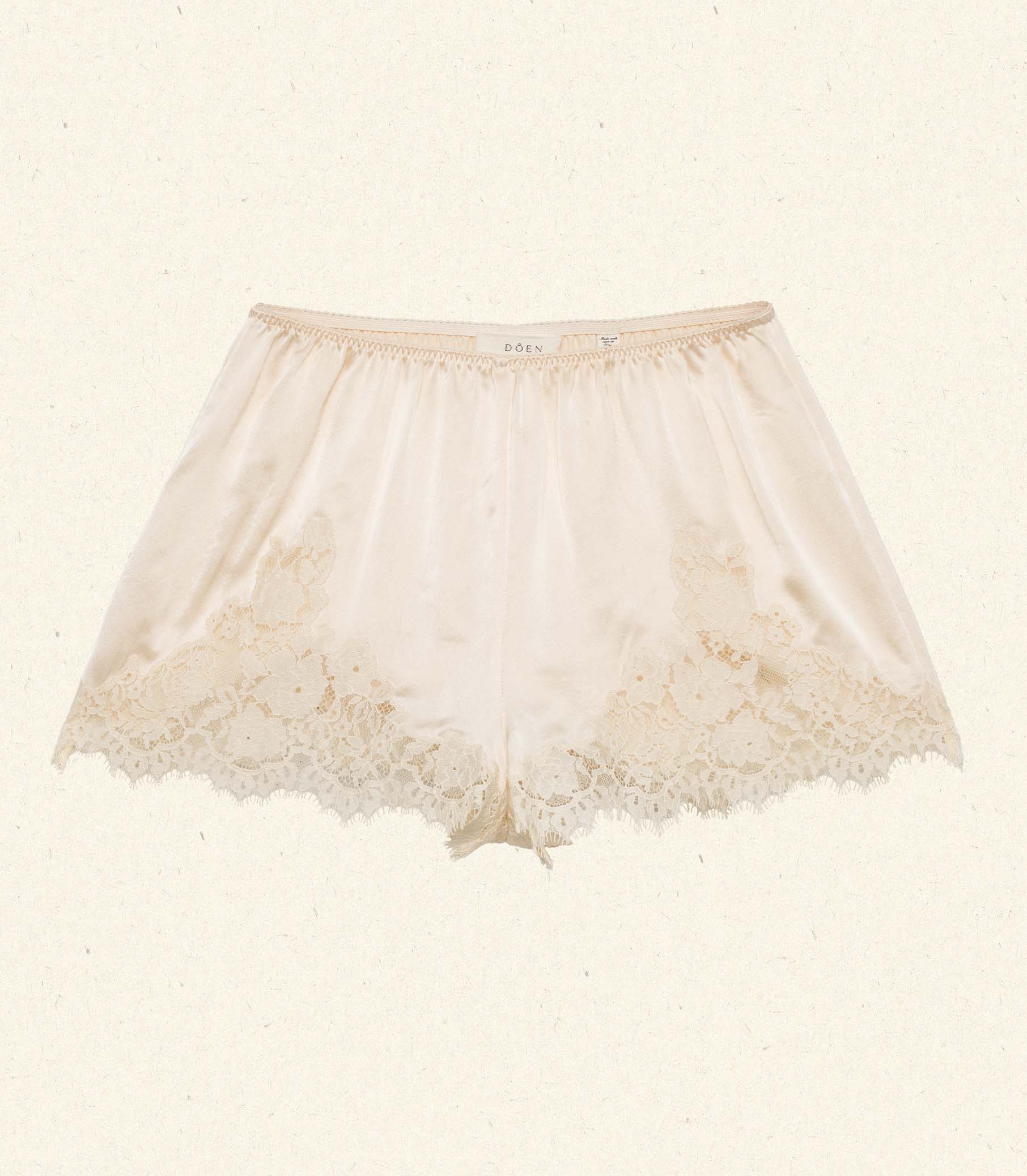 In buttery silk satin, the ‘30s-inspired Iona Short is an effortless pull-on style, featuring a high waist trimmed with elastic scallop detailing and intricate floral lace at the hems.
