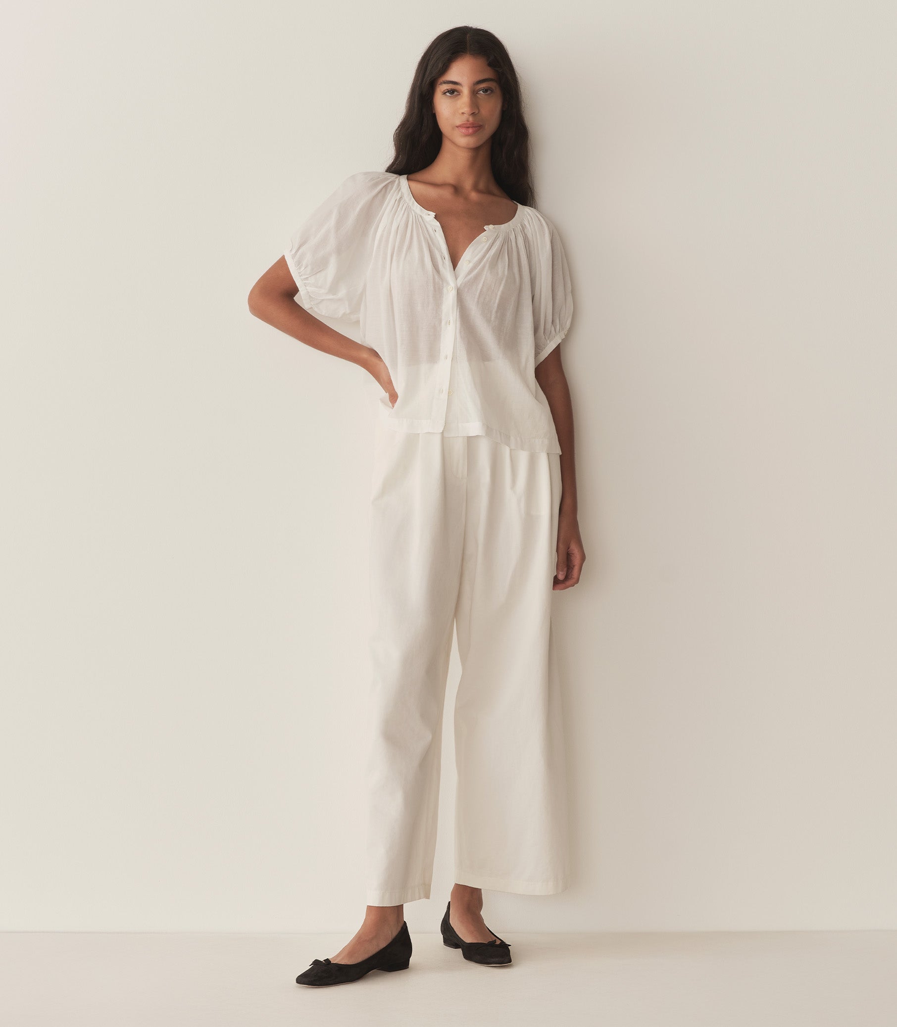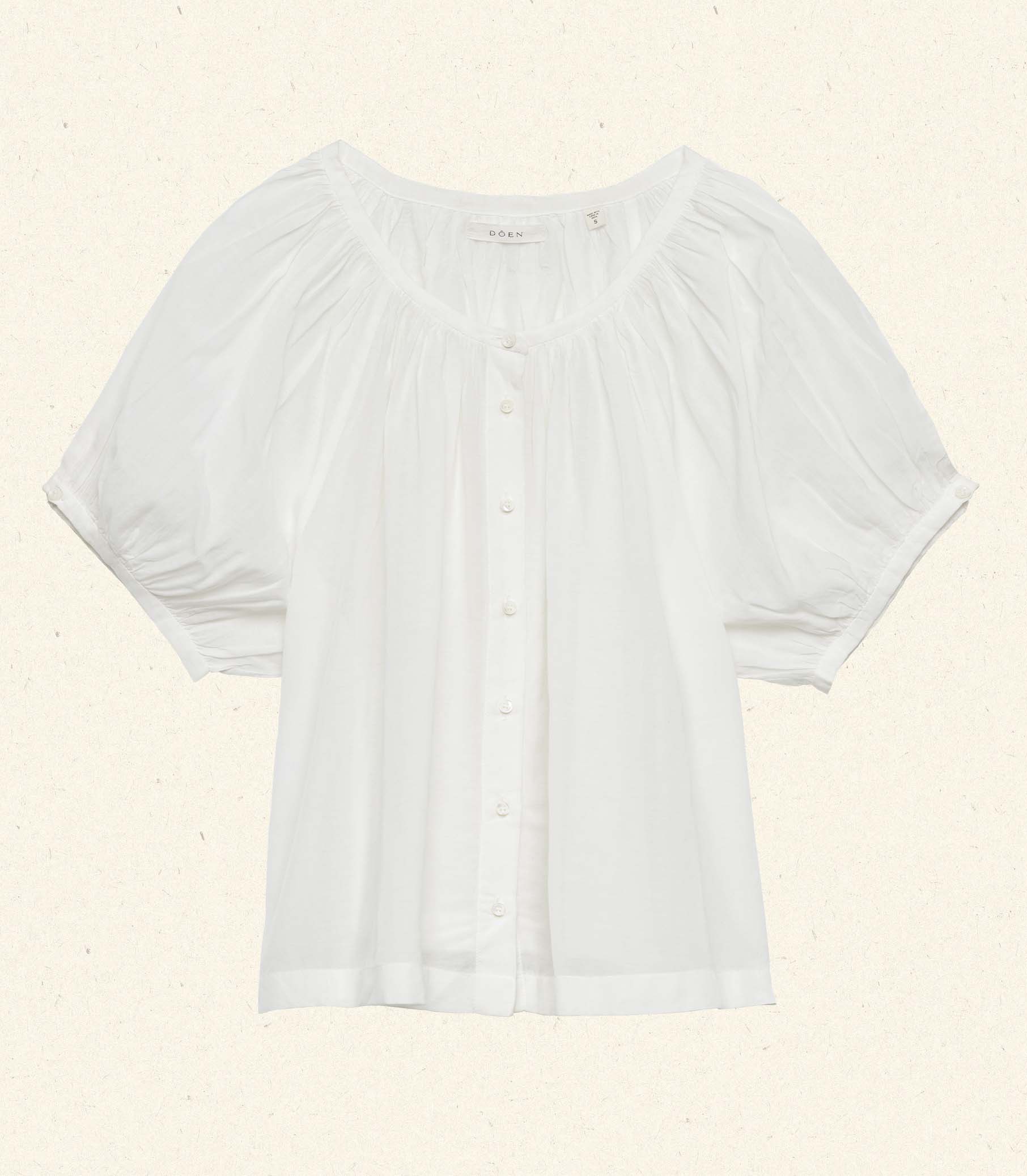 Crafted from a lightweight blend of organic cotton and viscose, the June Top is a short-sleeved take on our beloved Jane Blouse. It features a gathered scoop neckline, full raglan sleeves, and a relaxed, breezy cut. A line of mother-of-pearl buttons extends down the center front. Wear it loose, or tuck it into your favorite high-waisted jeans or shorts.
