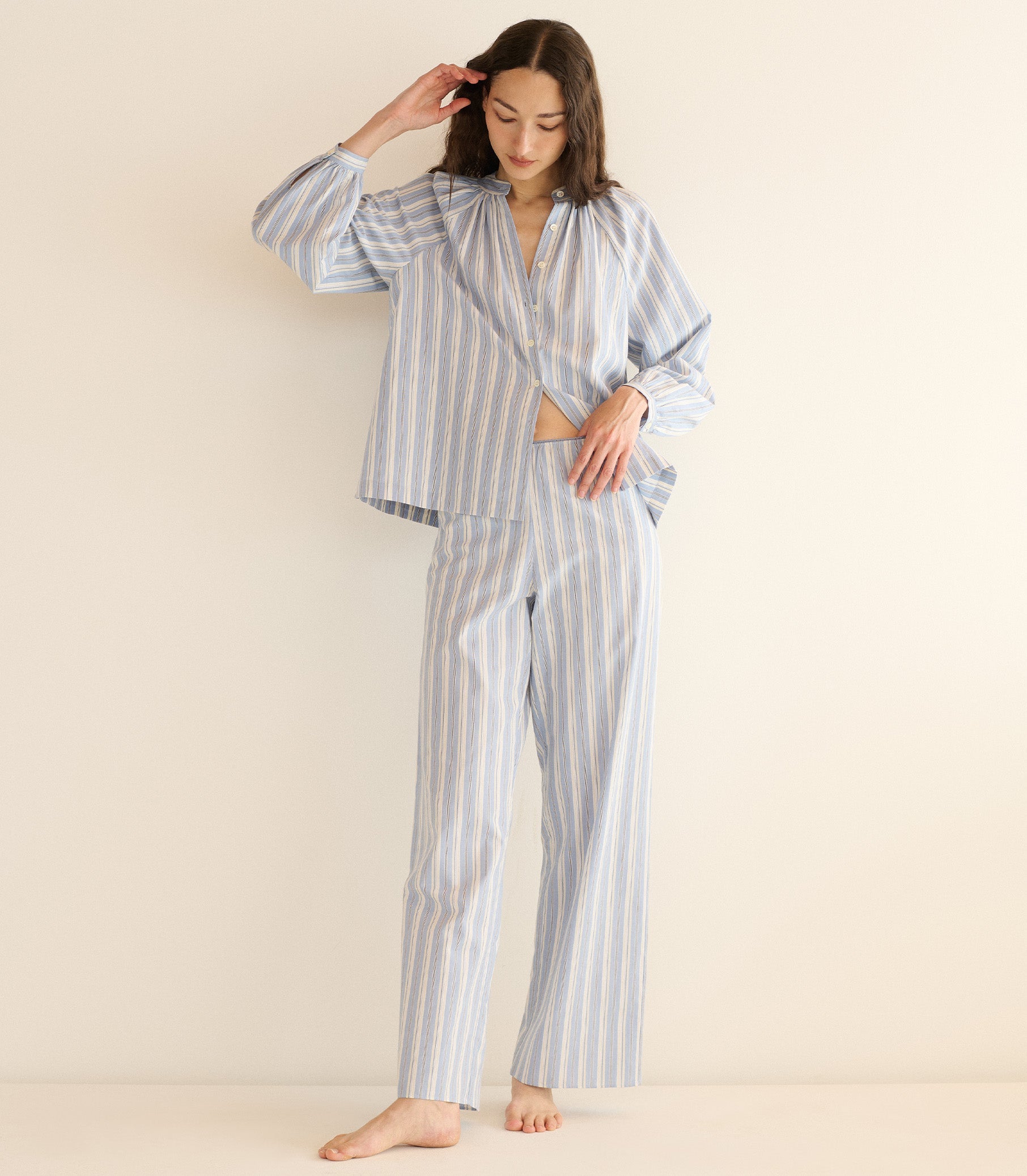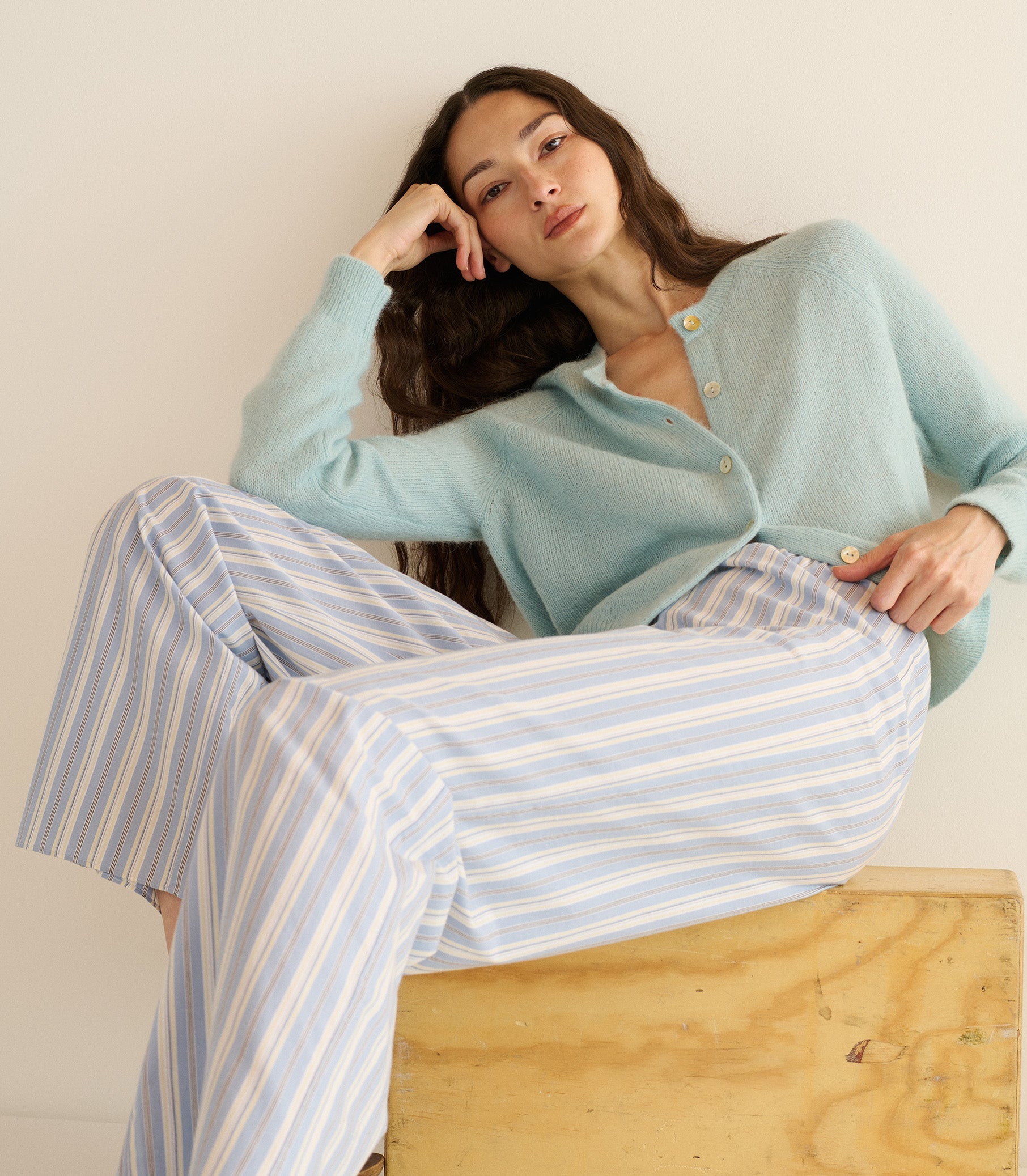 A new iteration of our beloved Lavon Pant, the Lavona features a slightly lower rise and the same effortless pull-on silhouette. Crafted from soft, washed organic cotton shirting fabric and in our yarn-dyed Loiret Stripe, it’s designed with a relaxed leg and finished with delicate scalloped elastic at the waistband.