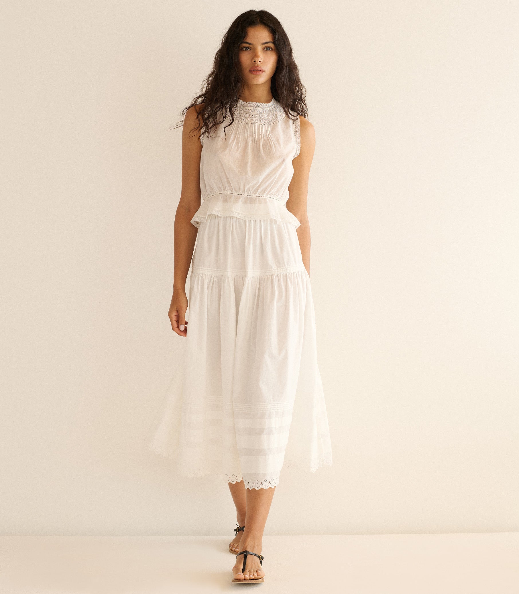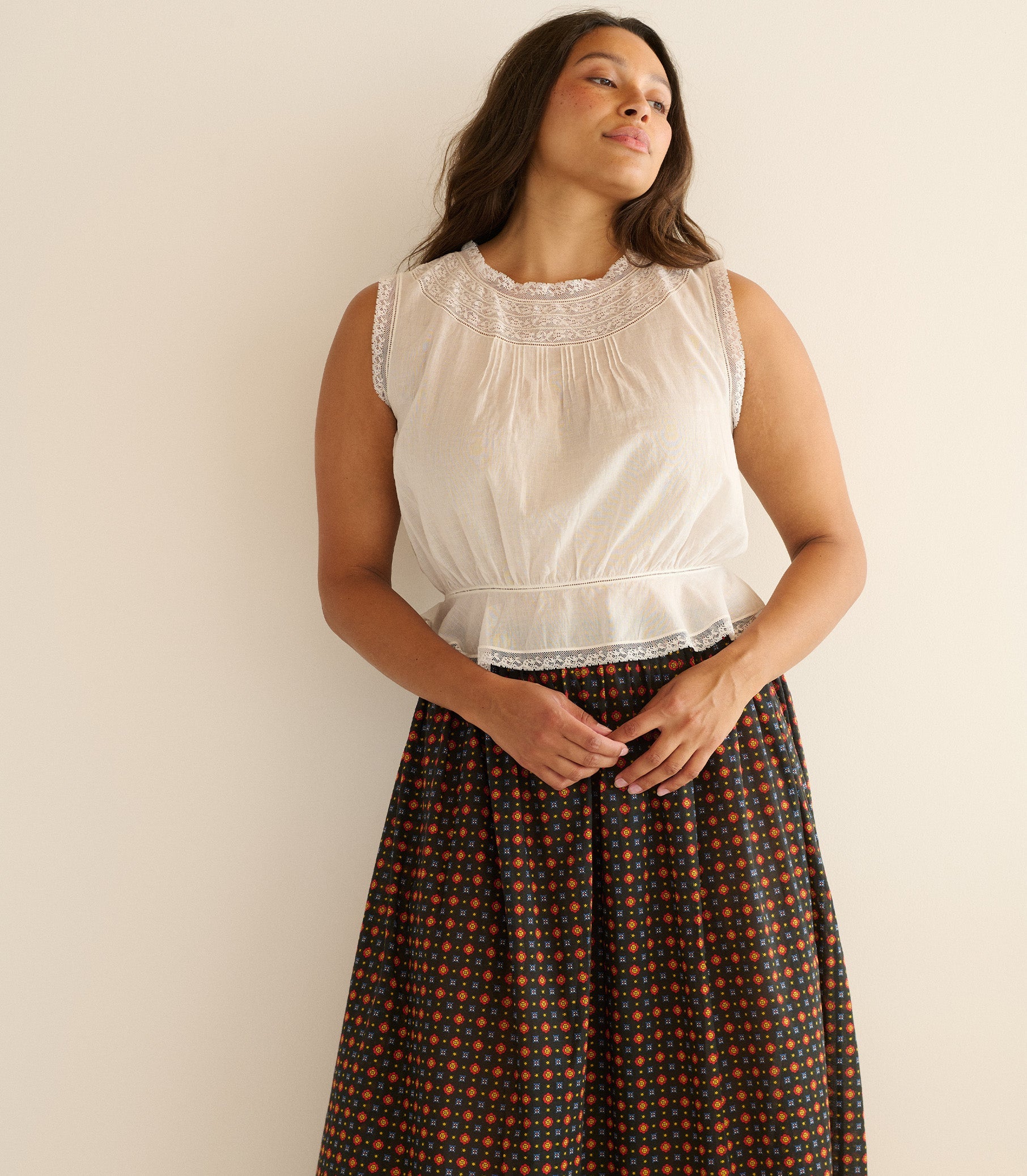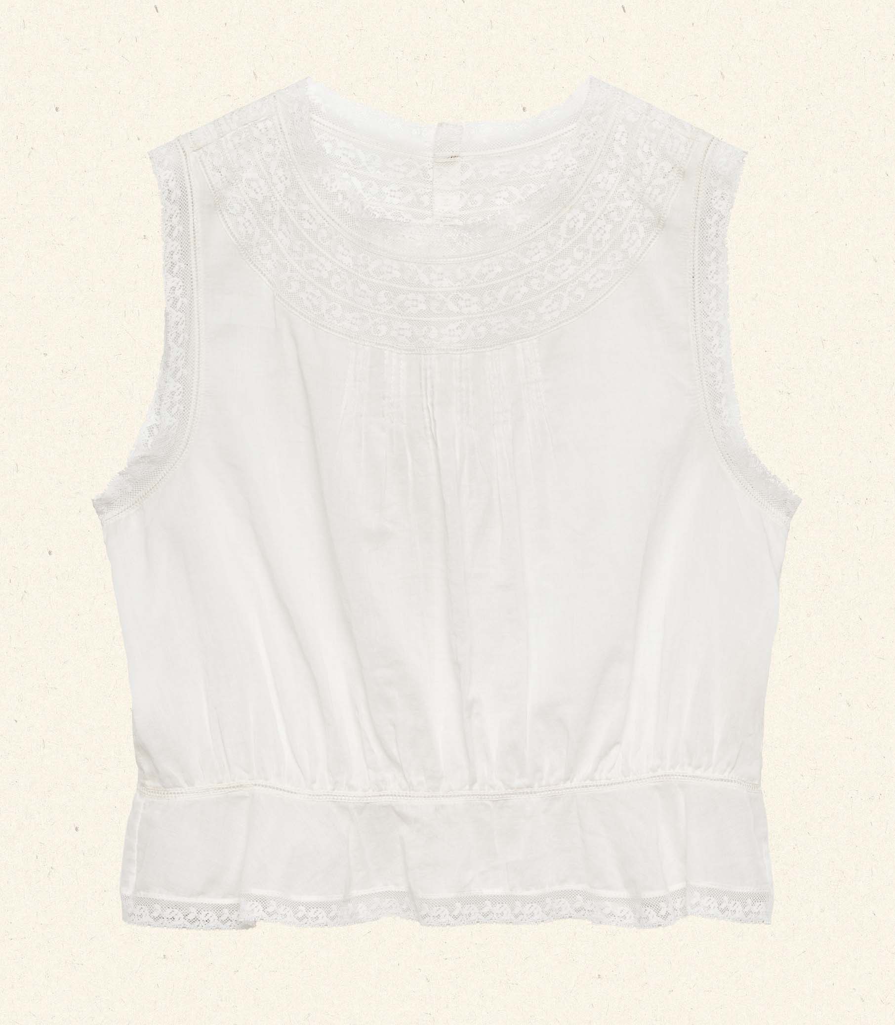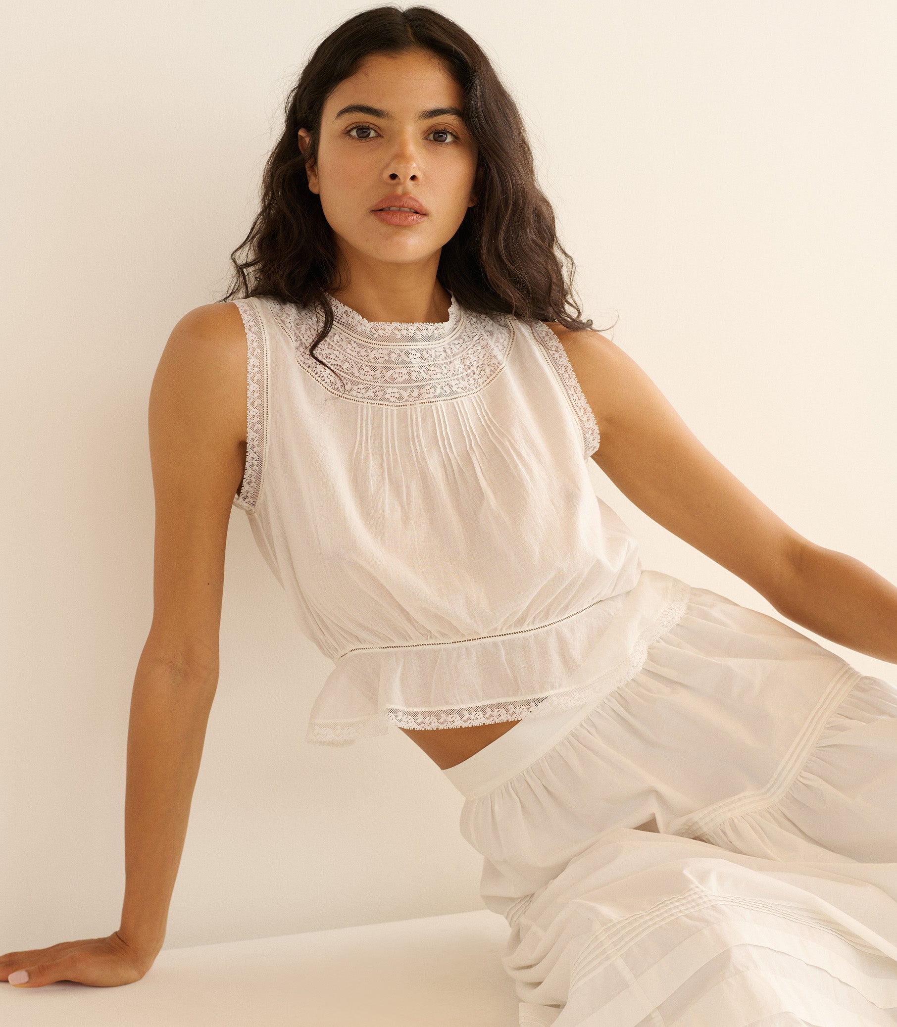 Our Edwardian-inspired Lilibet Top returns, now in a lightweight organic cotton voile. It features a high neck adorned with intricate inset lace and ladder trim, clustered pintucks at the yoke and back, and inset ladder trim at the waistline. Mother-of-pearl buttons extend down the back, while scallop-edged floral lace trims the neckline, sleeve openings, and hem.