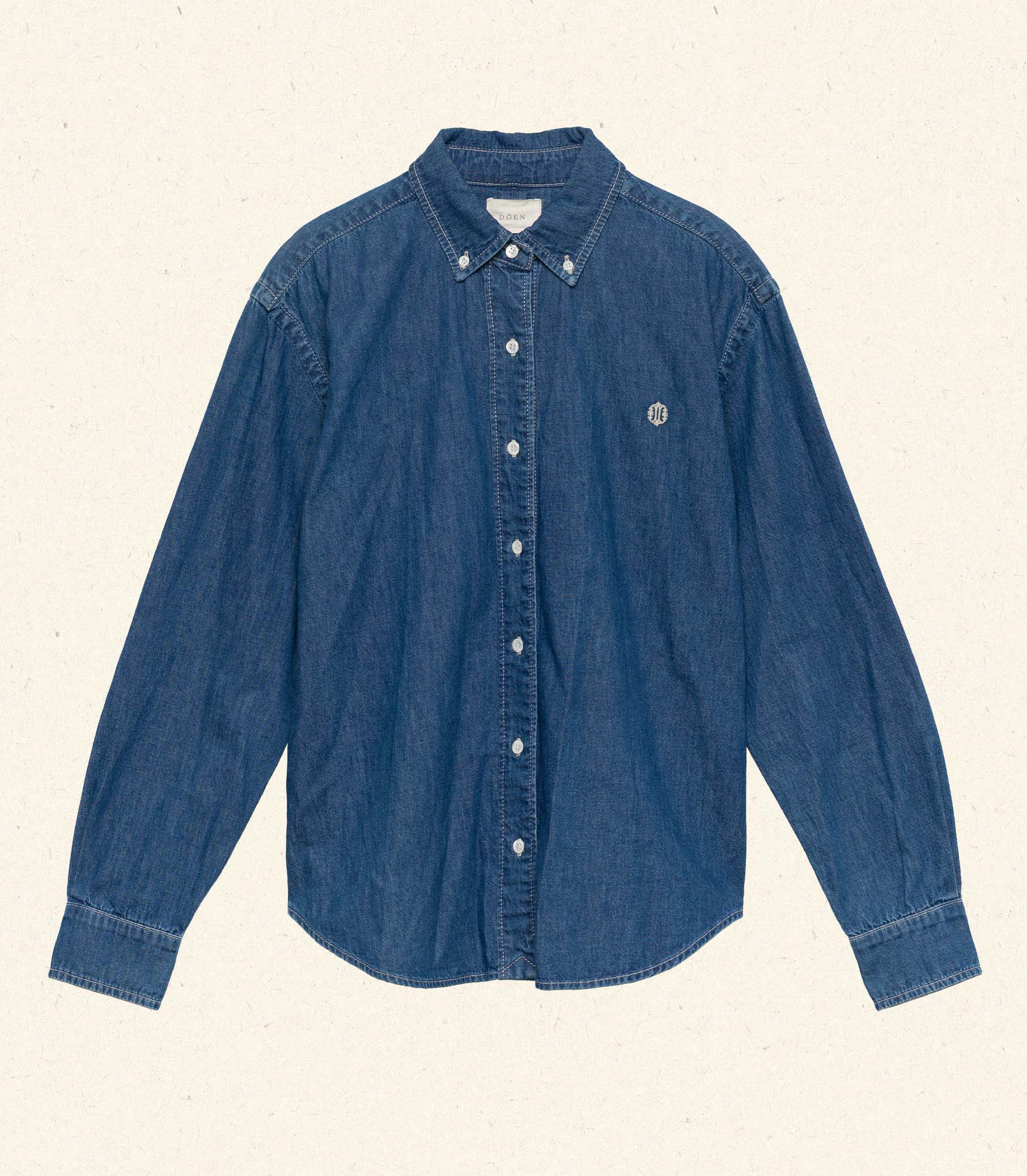 Tailored in soft, 100% cotton denim, the Linnea Shirt is a Western-inspired button-down shirt. It features a classic collar, full-length sleeves, and mother-of-pearl buttons down the front. The hem dips slightly longer in back, and an embroidered “D” monogram at the chest lends a sweet finishing touch.
