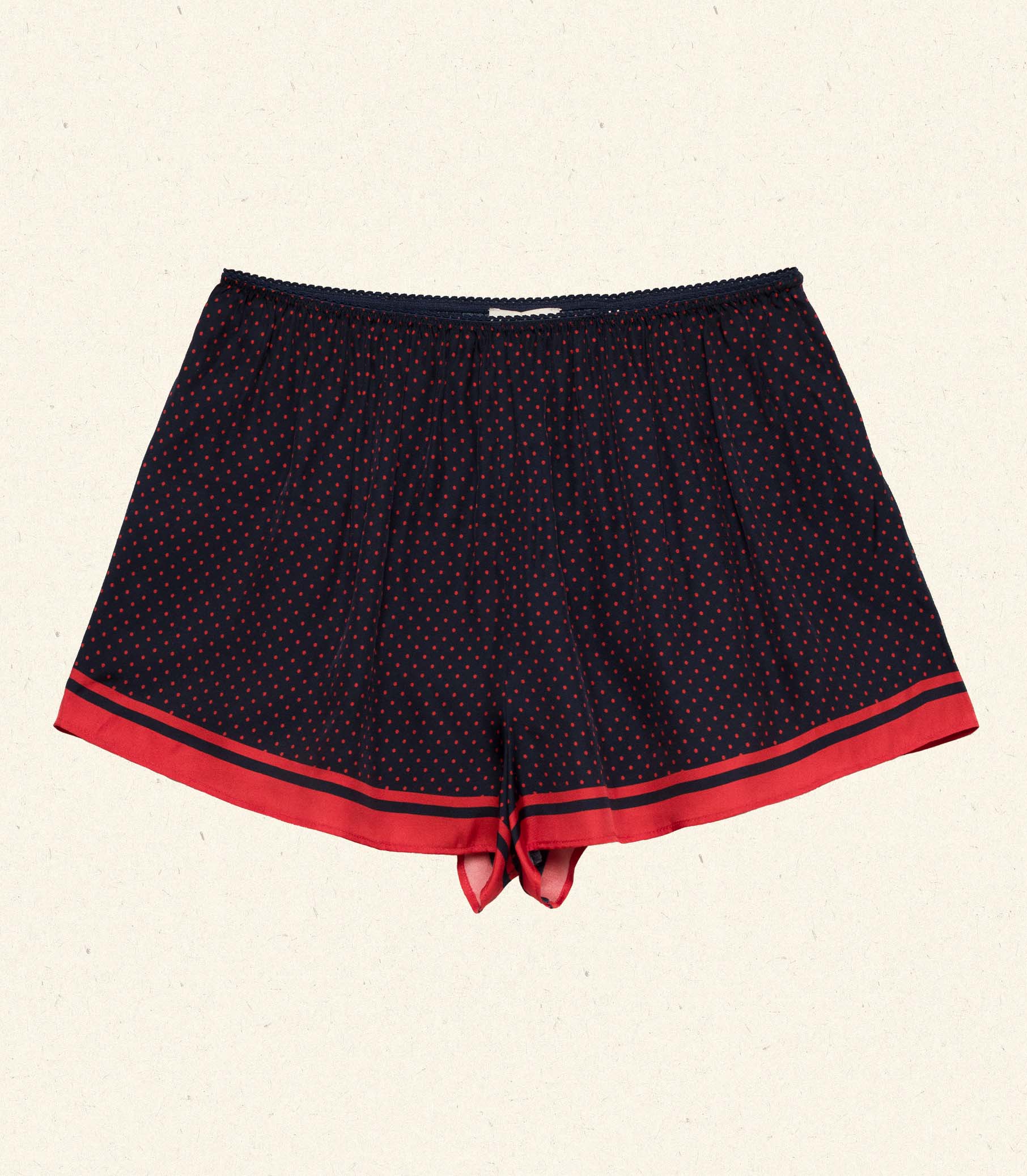 An effortless pull-on short, the Loren returns, now in a silk-viscose twill adorned with a playful navy-and-red Colette Dot. The high waist is trimmed with delicate scalloped elastic, while a placed stripe border finishes the hems