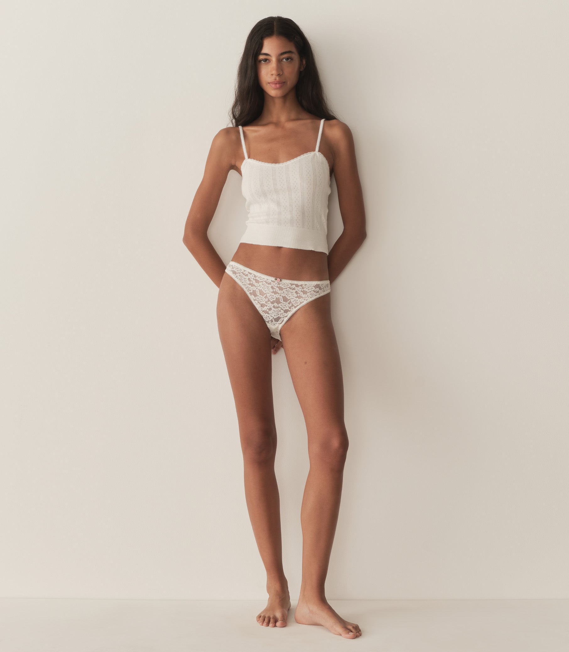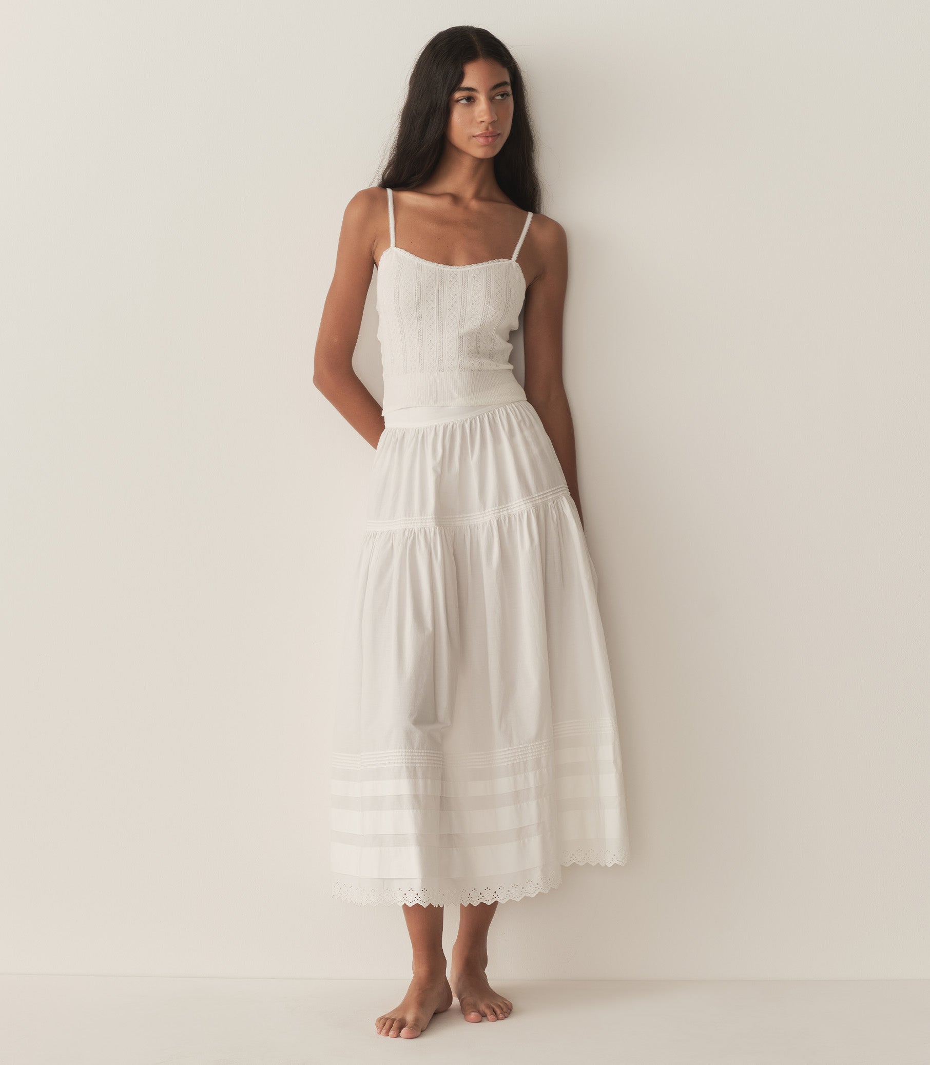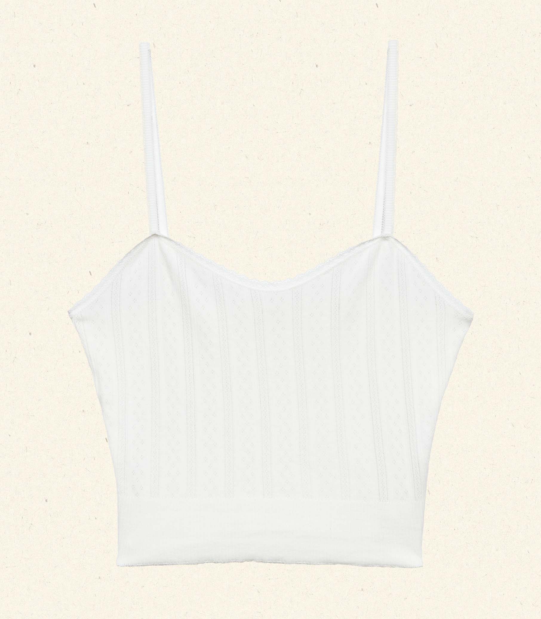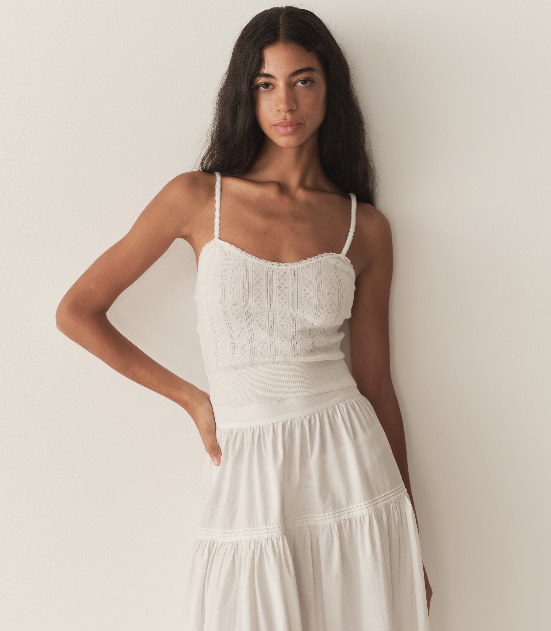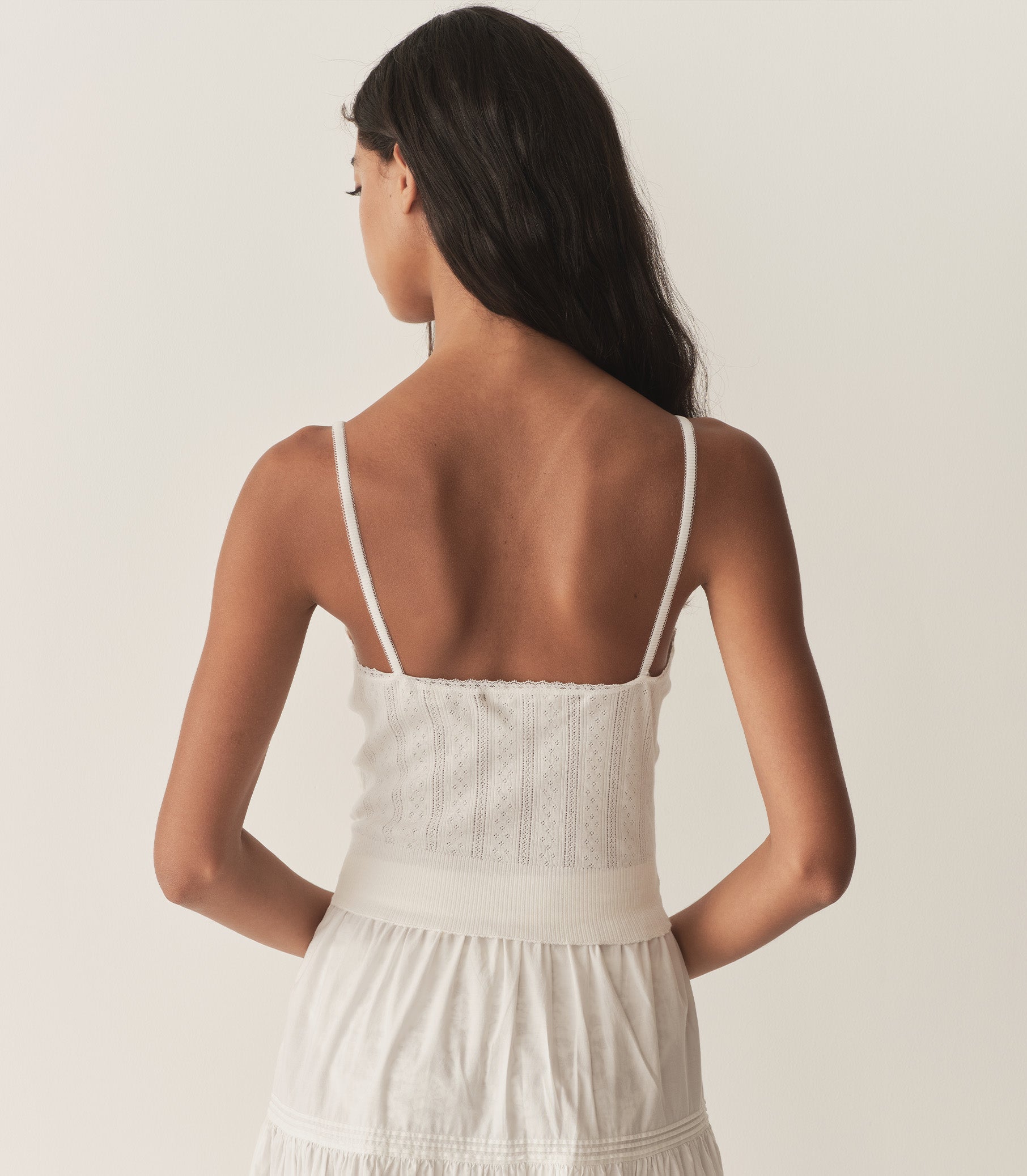 In the softest organic cotton, the Maria Tank features a cropped, fitted silhouette with a nipped waist and an allover pointelle design. Delicate elastic lace trims the sweetheart neckline and thin, stretchy grosgrain straps.