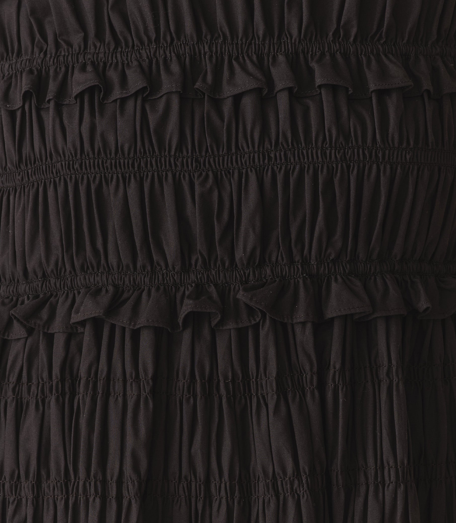 Crafted from crisp organic cotton poplin, the Marianne Dress features a square neckline, a gathered bust, and a fitted bodice framed with petite ruffles. A third gathered panel finishes just below the hips, flaring out into a full-length skirt, while elastic lends give to the straps, bust, and waist.