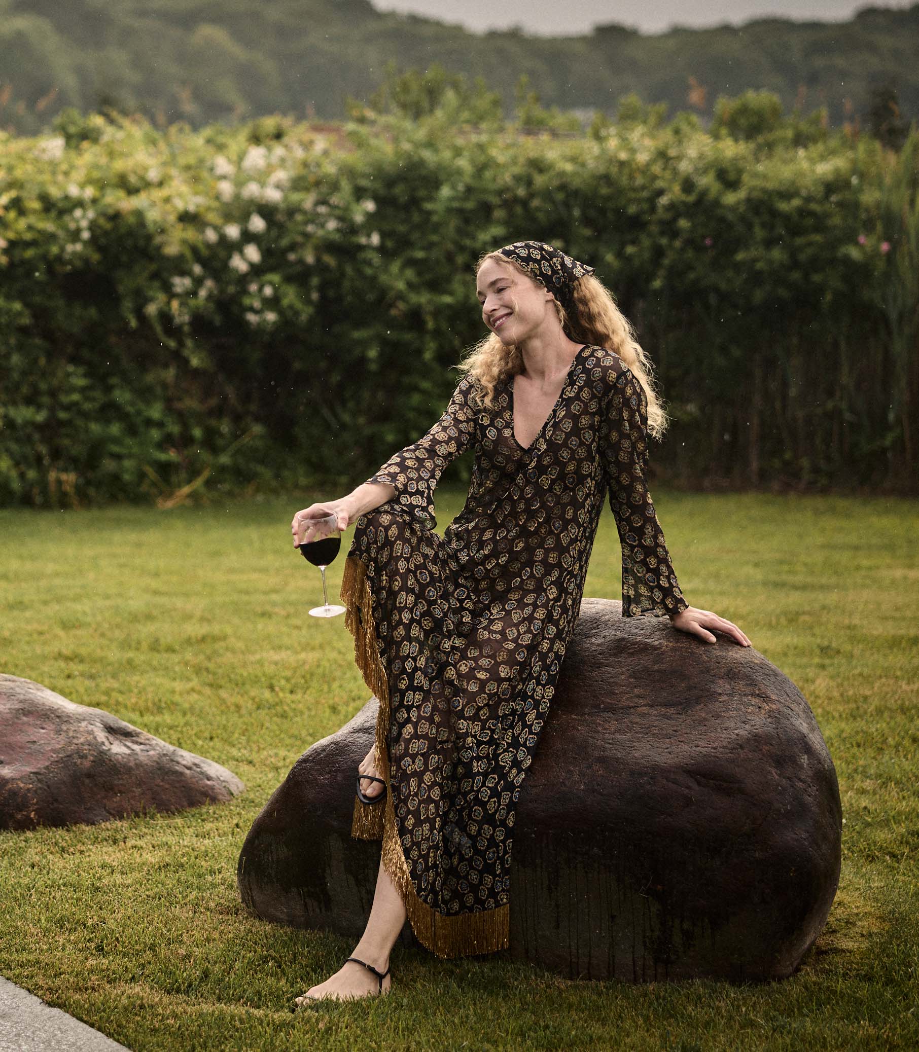 Crafted from silk crinkle chiffon, the DÔEN Heirloom Monique Dress is an extra-special keepsake and favorite of our co-founders, Margaret and Katherine. With a ‘70s-inspired caftan silhouette, this treasure is graced with our Joni Floral, and each floral motif is finished with intricate gold lamé embroidery. Dramatic flared sleeves fall to the wrist while stitching at the center front neckline lends shape. A floor-sweeping hemline is trimmed with hand-beaded fringe. A matching belt can be tied to cinch the waist—or worn as a scarf.