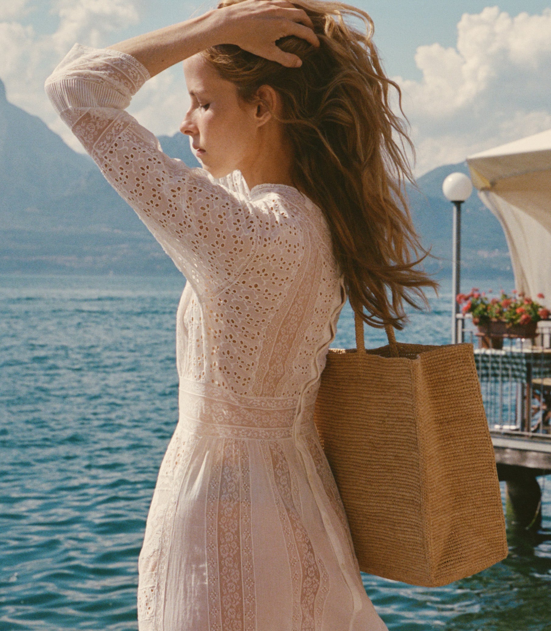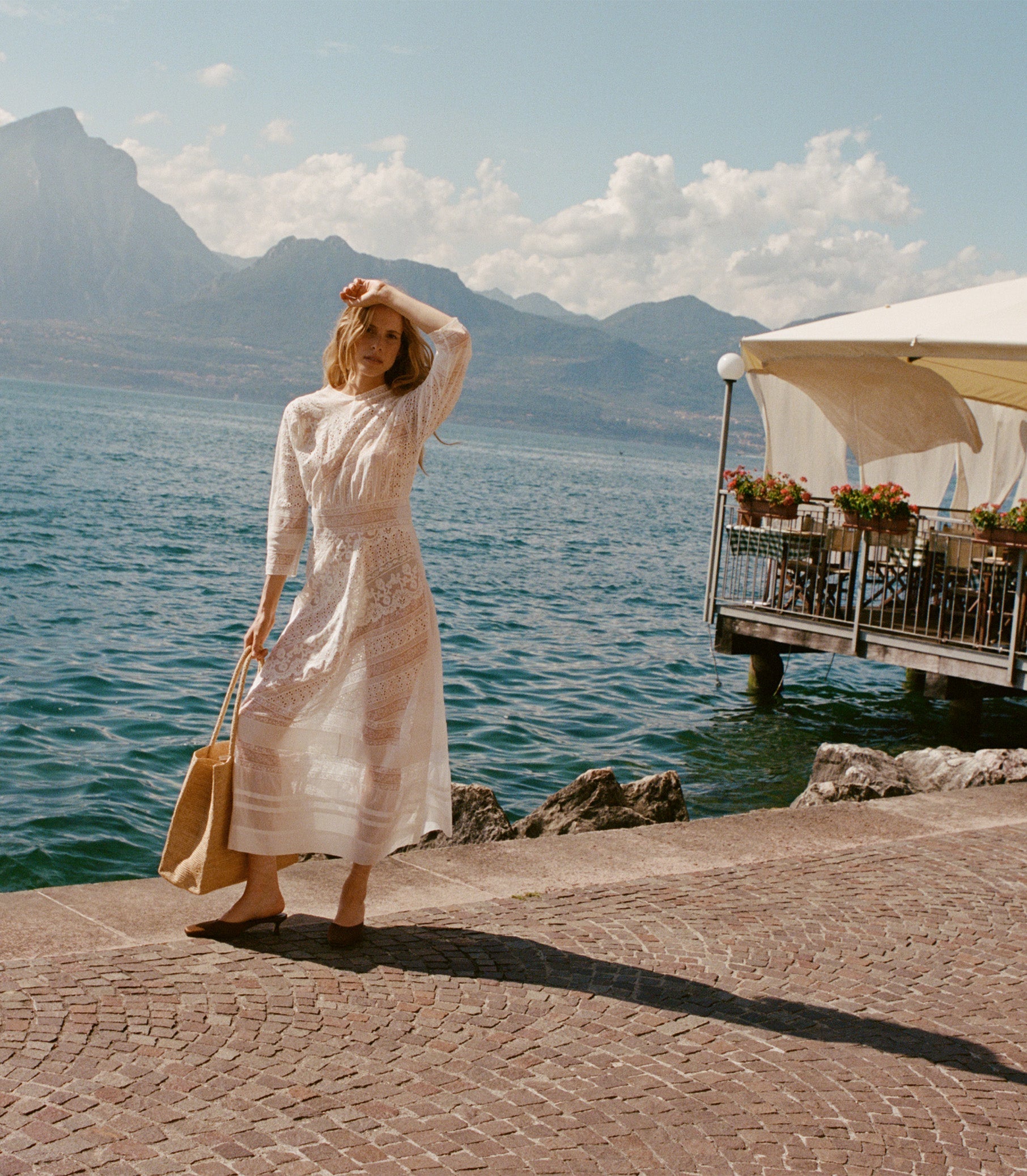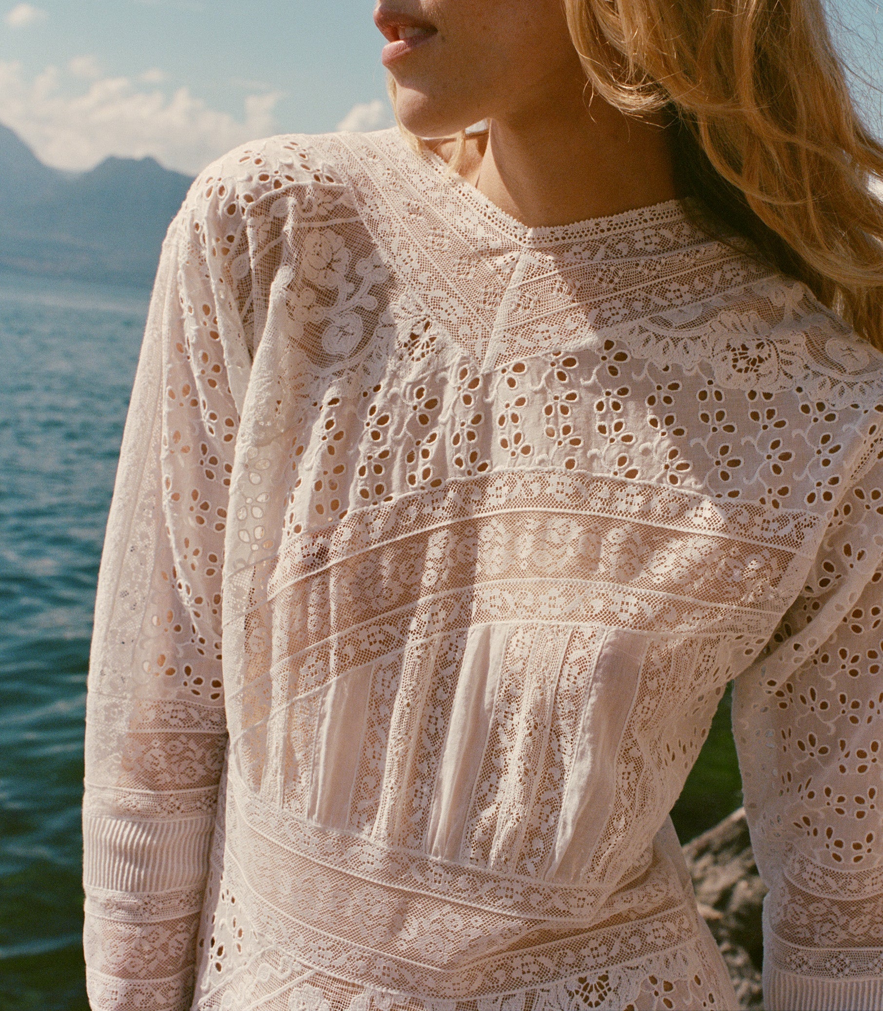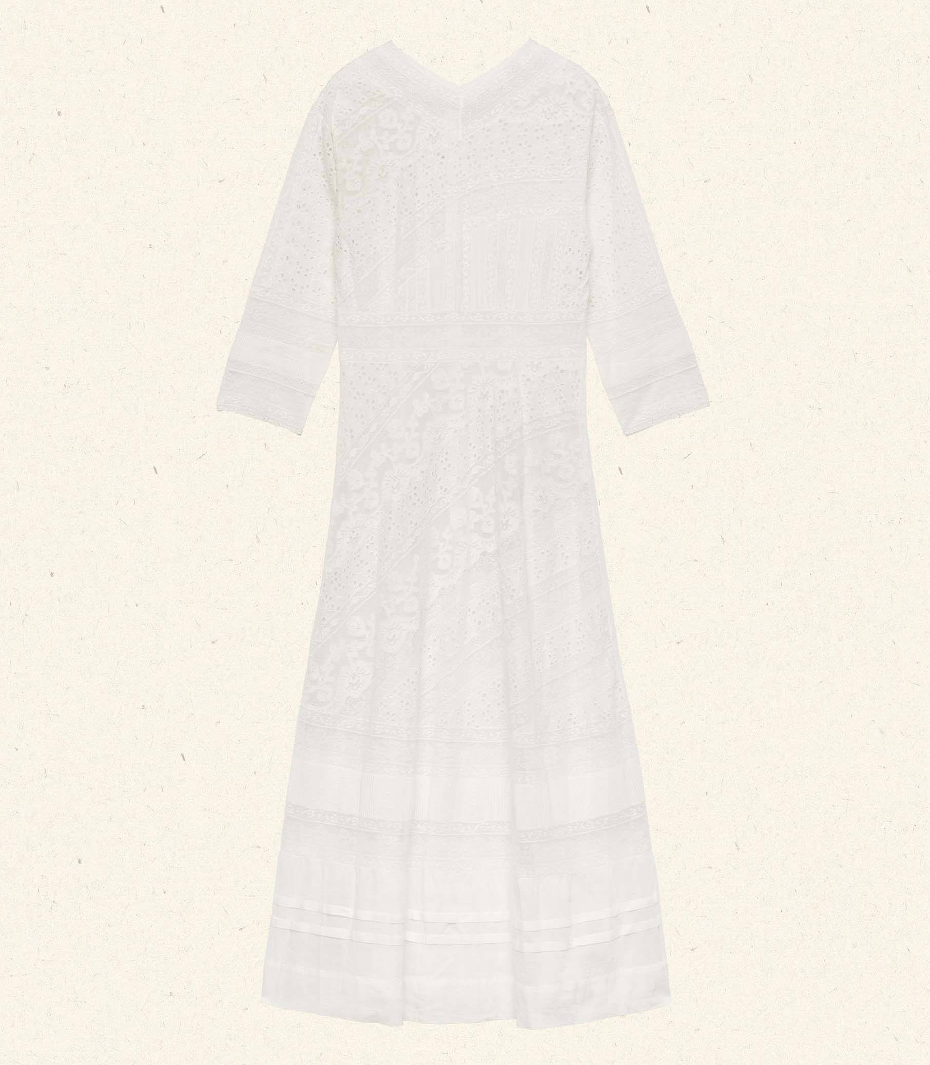 In lightweight, organic cotton voile, the DÔEN Heirloom Orelie Dress takes inspiration from Edwardian-era day dresses. Detailed with alternating panels of floral lace, clustered pintucks, and eyelet embroidery, this intricate treasure features a high V-neckline, three-quarter-length sleeves, and an ankle-grazing A-line skirt. A line of starburst buttons extends down the back.