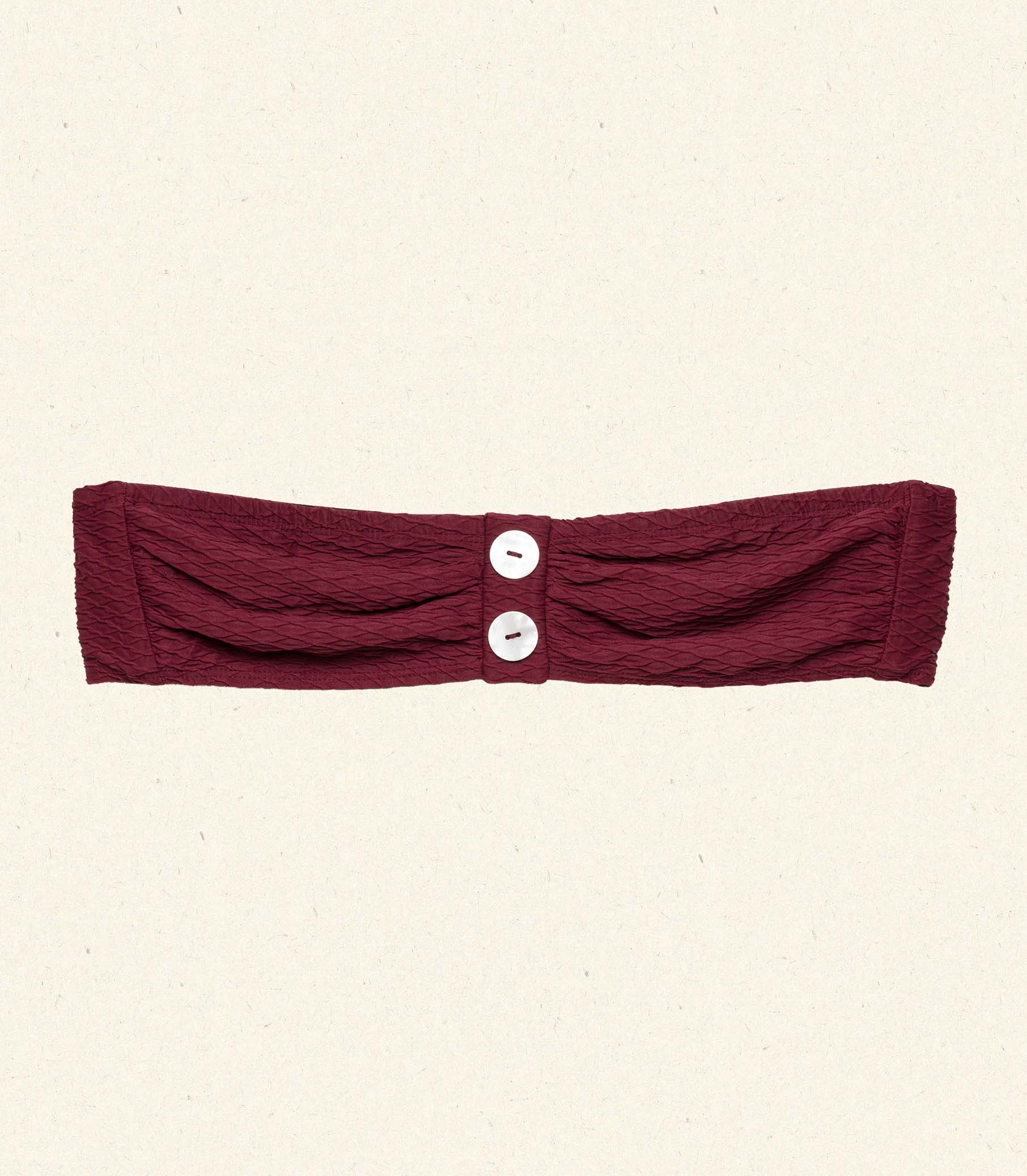 Inspired by 1960s swimwear, the Riva Bikini Top is a bandeau top crafted from a stretchy, honeycomb texture swim fabric and fully lined for comfort. A sweetheart neckline is accented with two oversized faux shell buttons, while zigzag stitching finishes the edges.