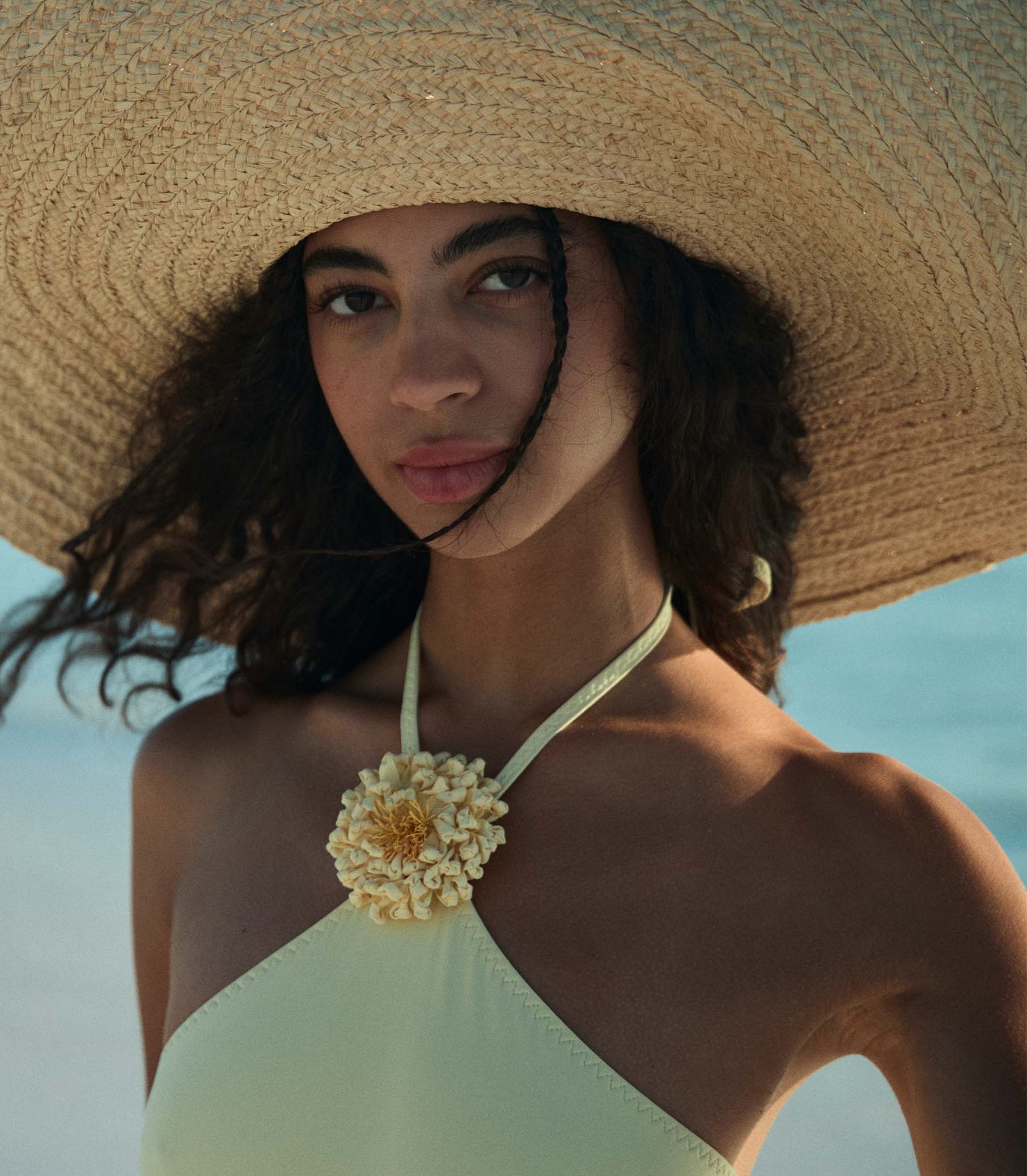 The Serafina Maillot is a fully lined halter one-piece with a medium coverage cut, featuring a detachable vintage-inspired floral rosette at the neck. Zigzag stitching adorn the edges.