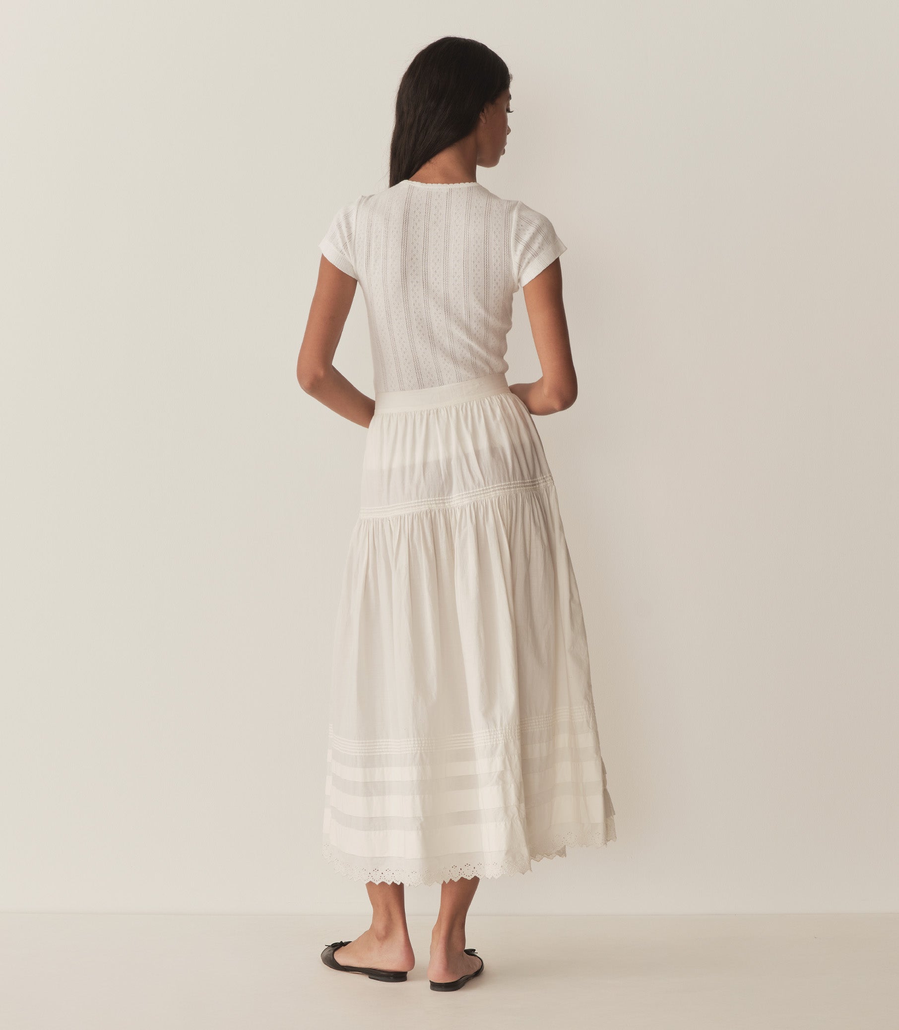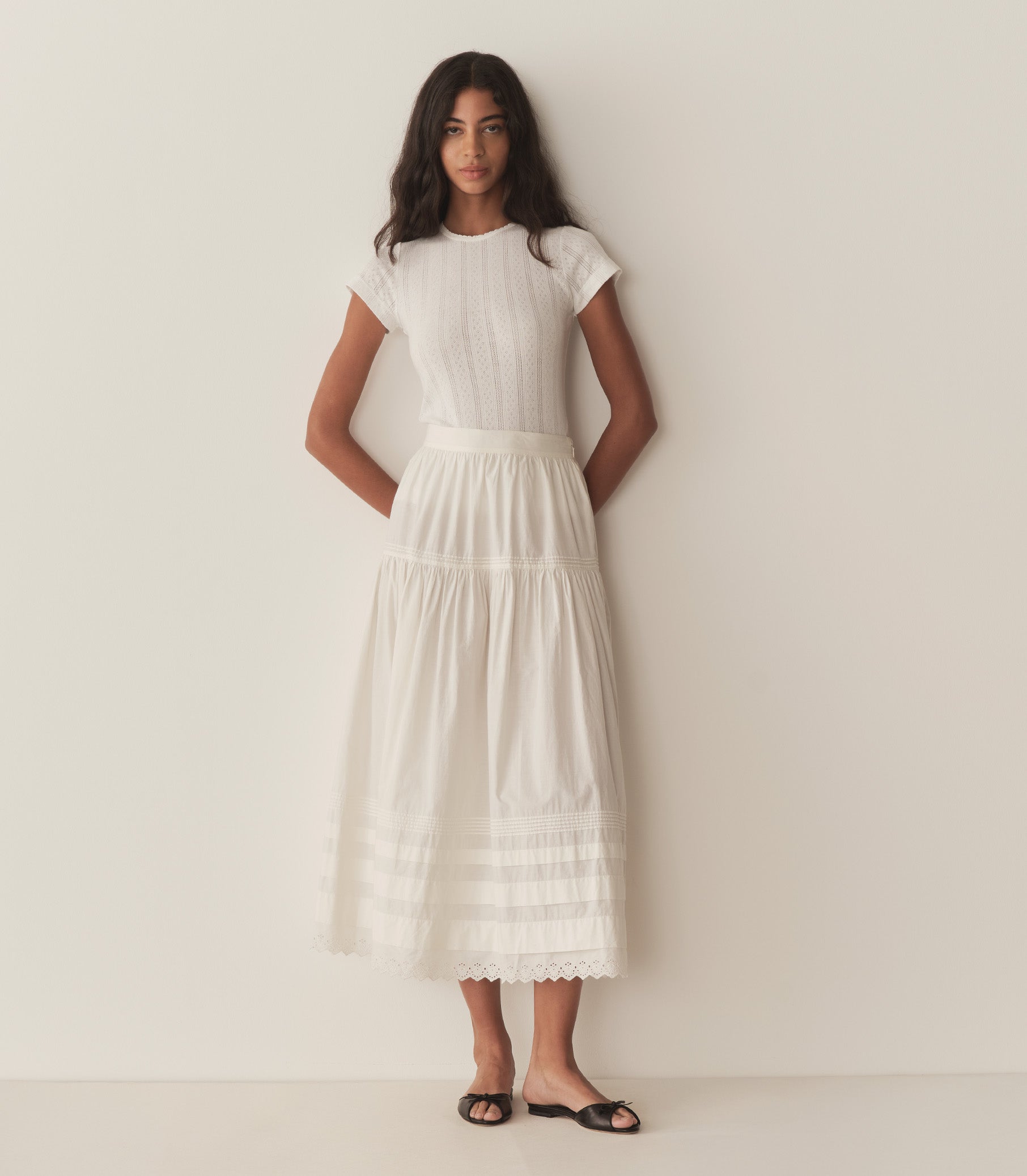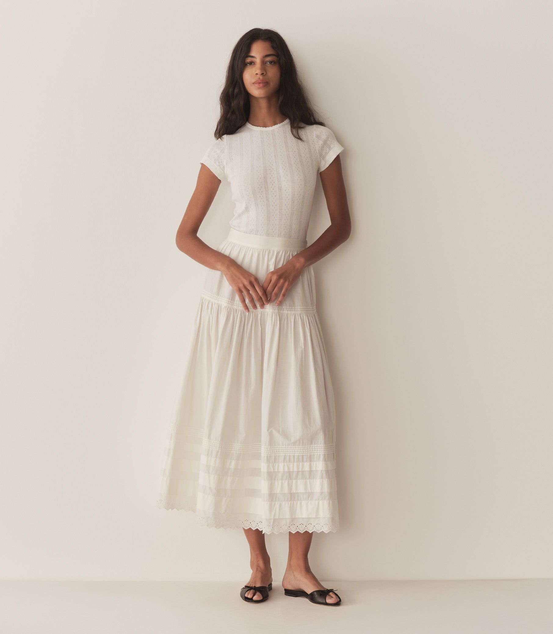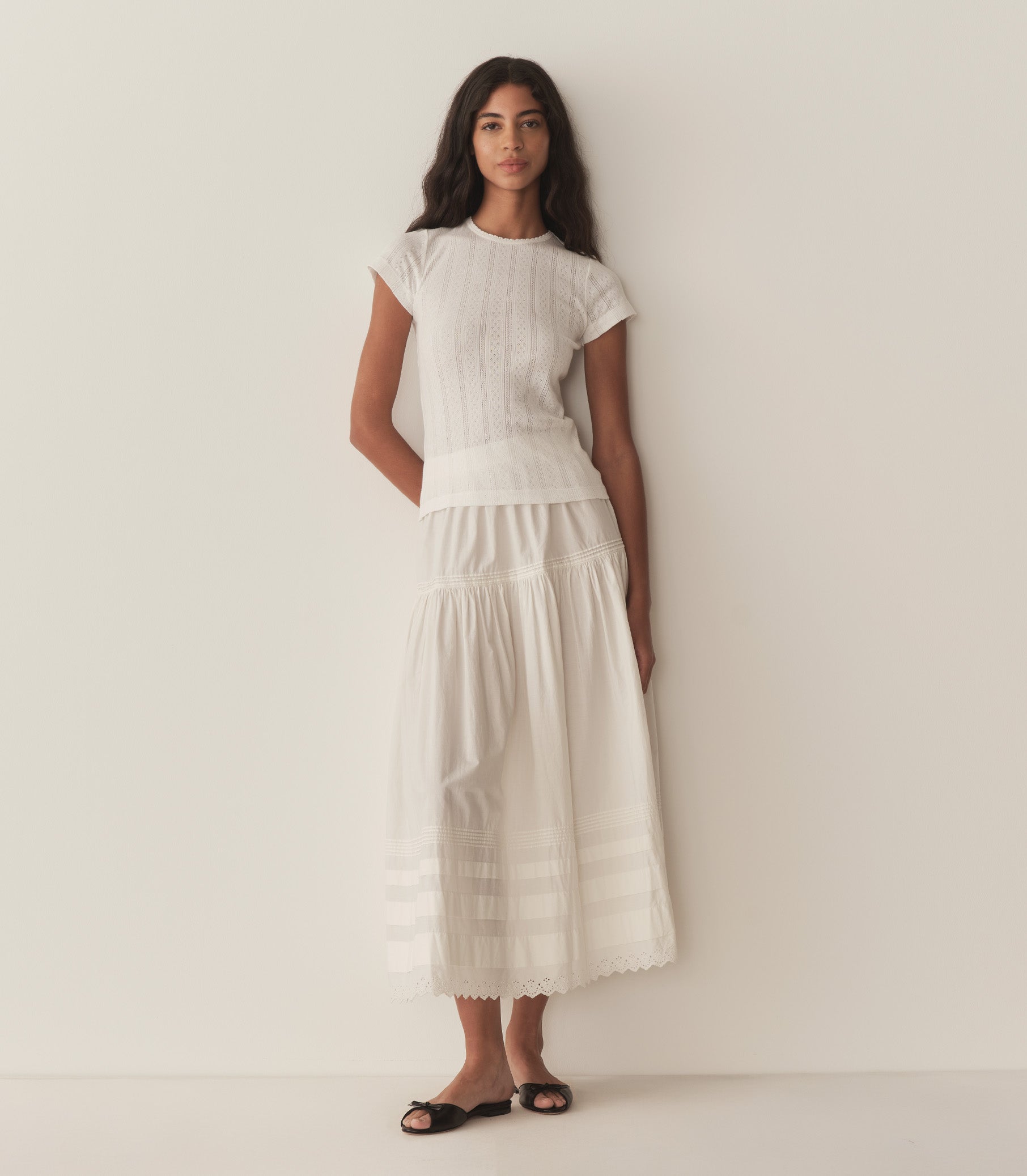 Crafted from the softest organic cotton pointelle, the Vivi Tee is a ‘90s-inspired baby tee with a fitted silhouette, short cap sleeves, and delicate scalloping along the neck opening.