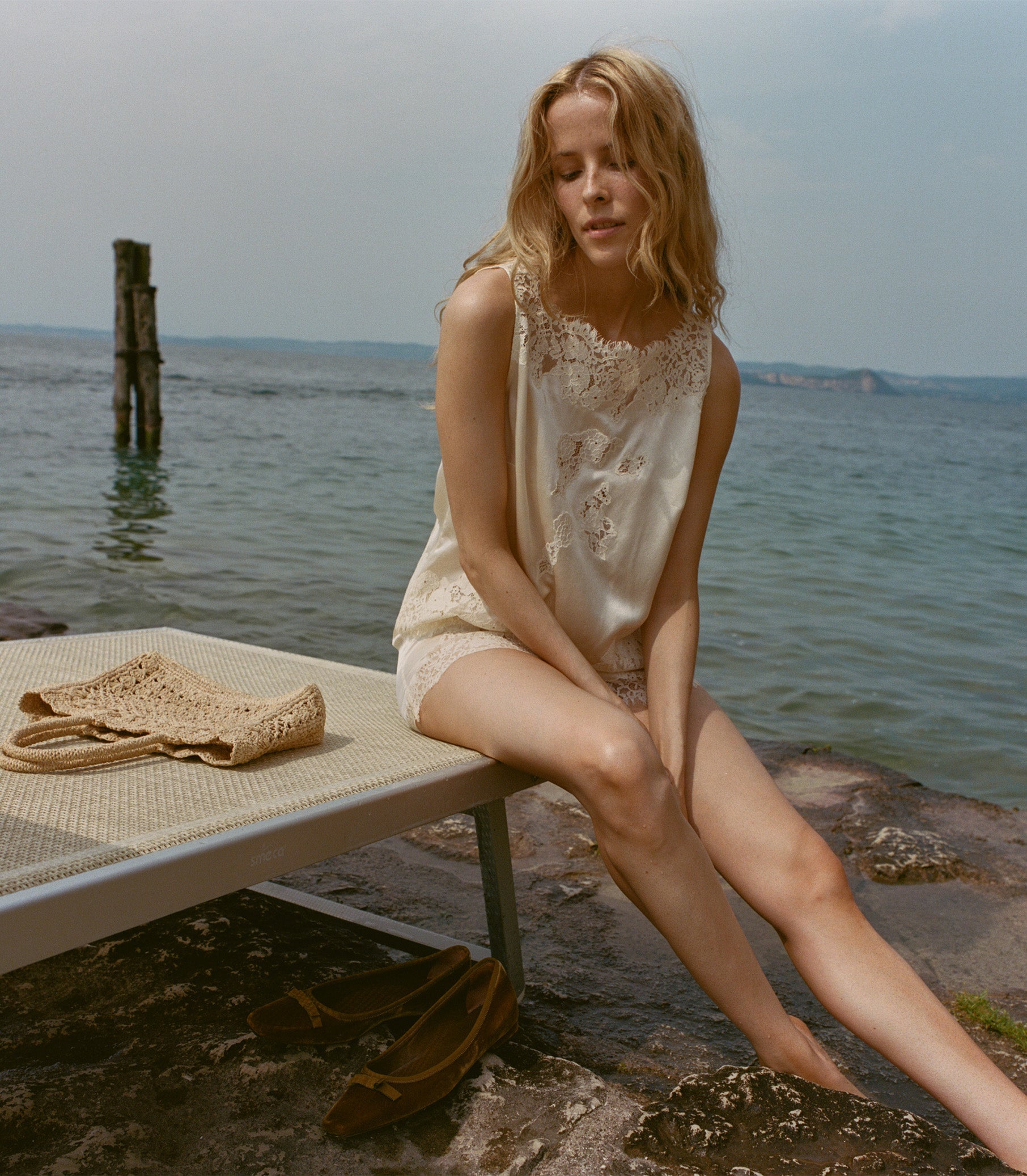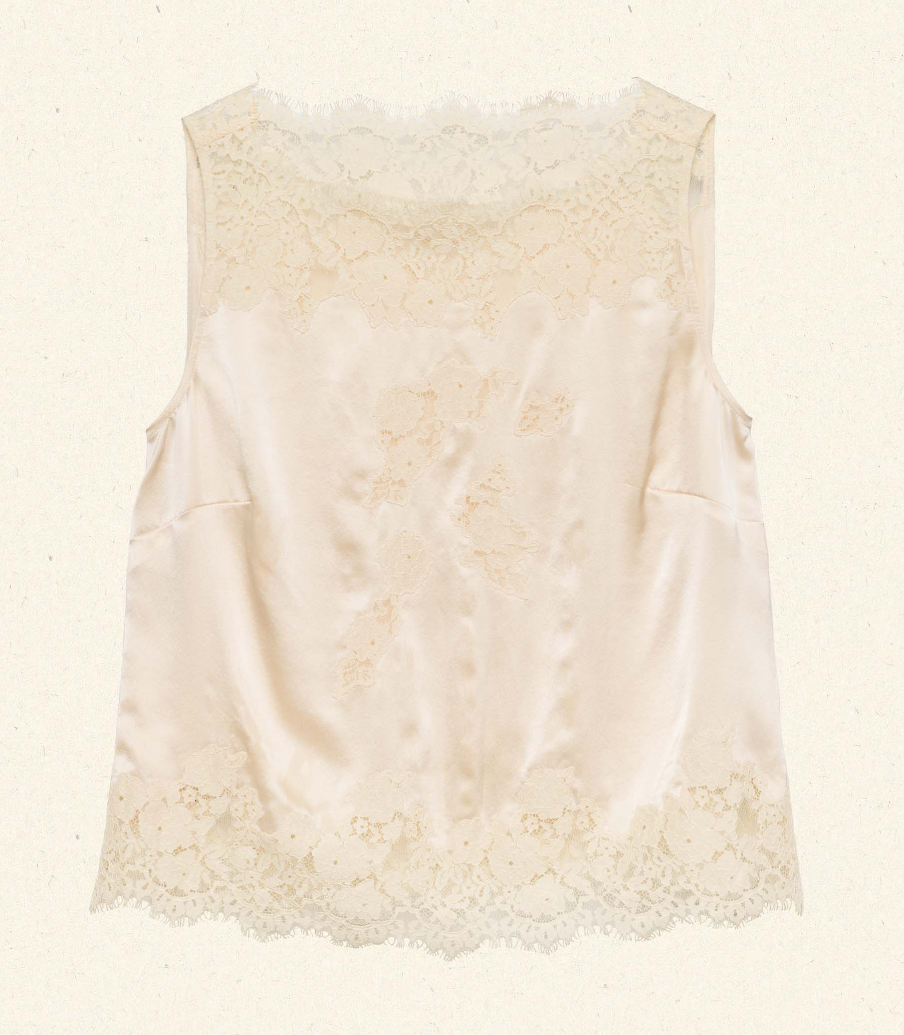 In buttery silk satin, the Viviane Top is an easy sleeveless top with a loose, boxy silhouette. Intricate floral lace adorns the high bateau neckline, bodice, and hem.